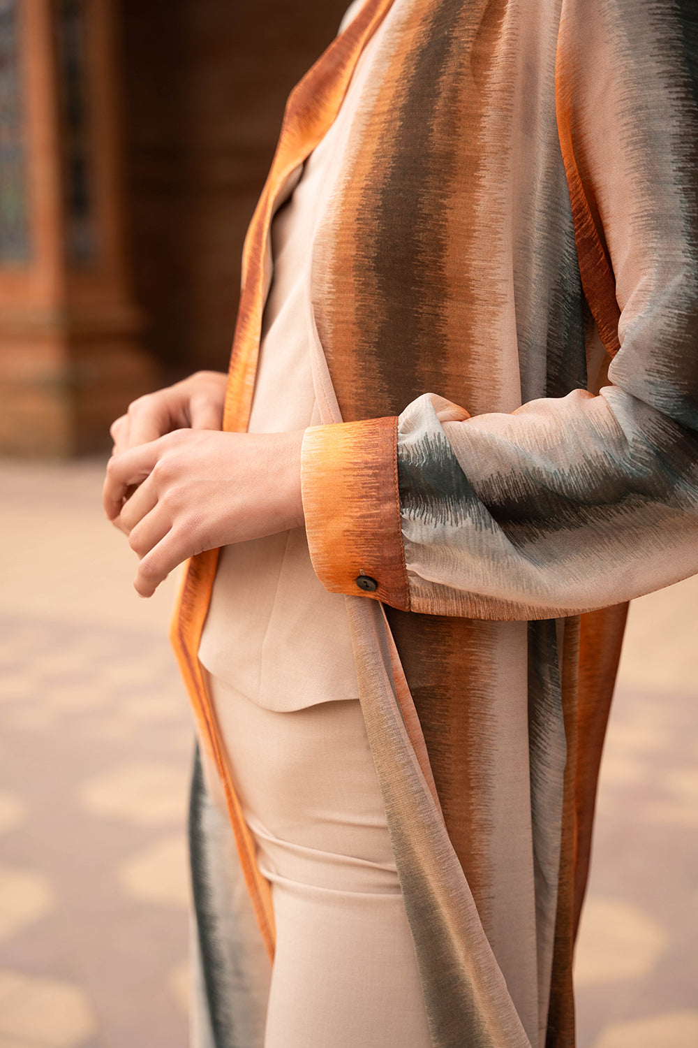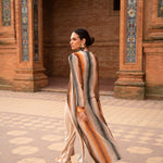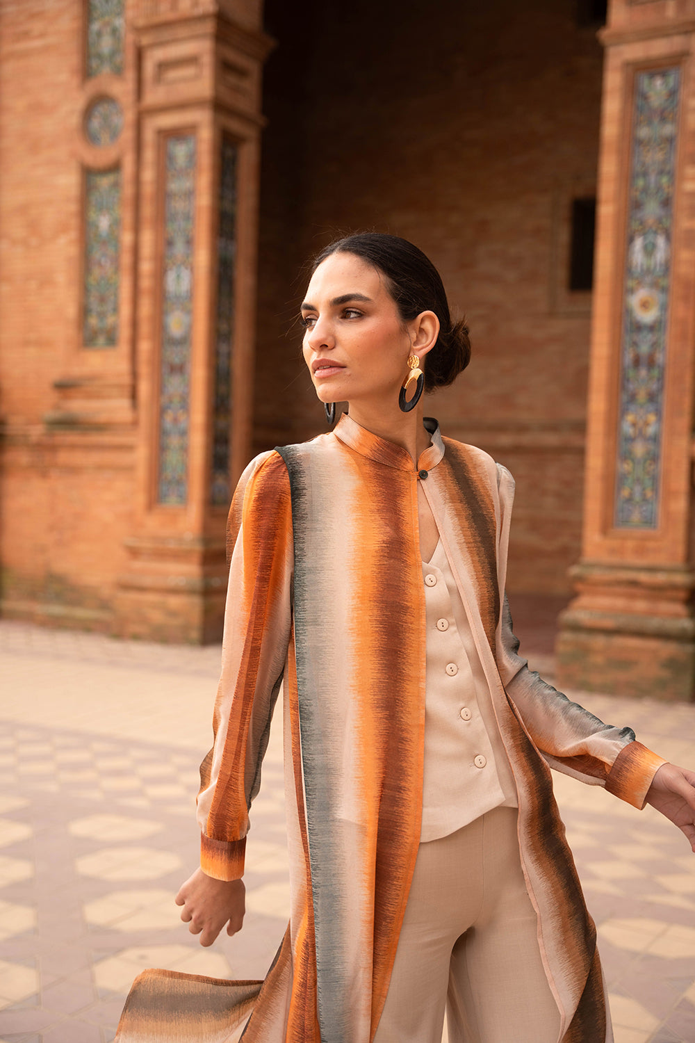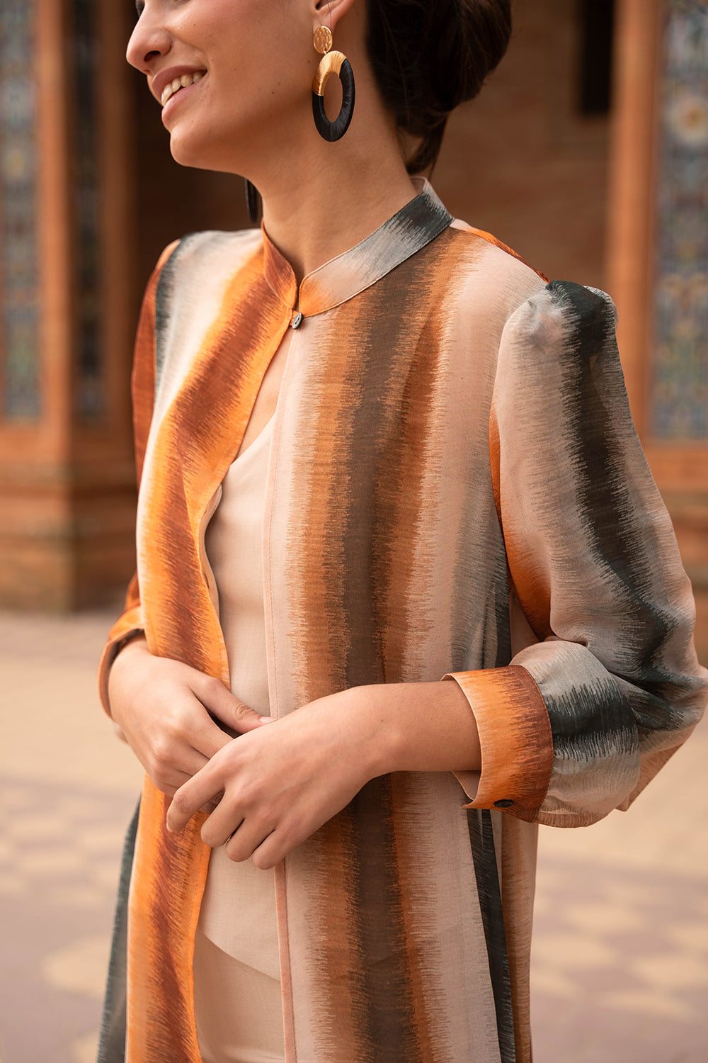 - Estampado de rayas verticales difuminadas en tonos tierra, caldero y petróleo