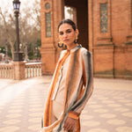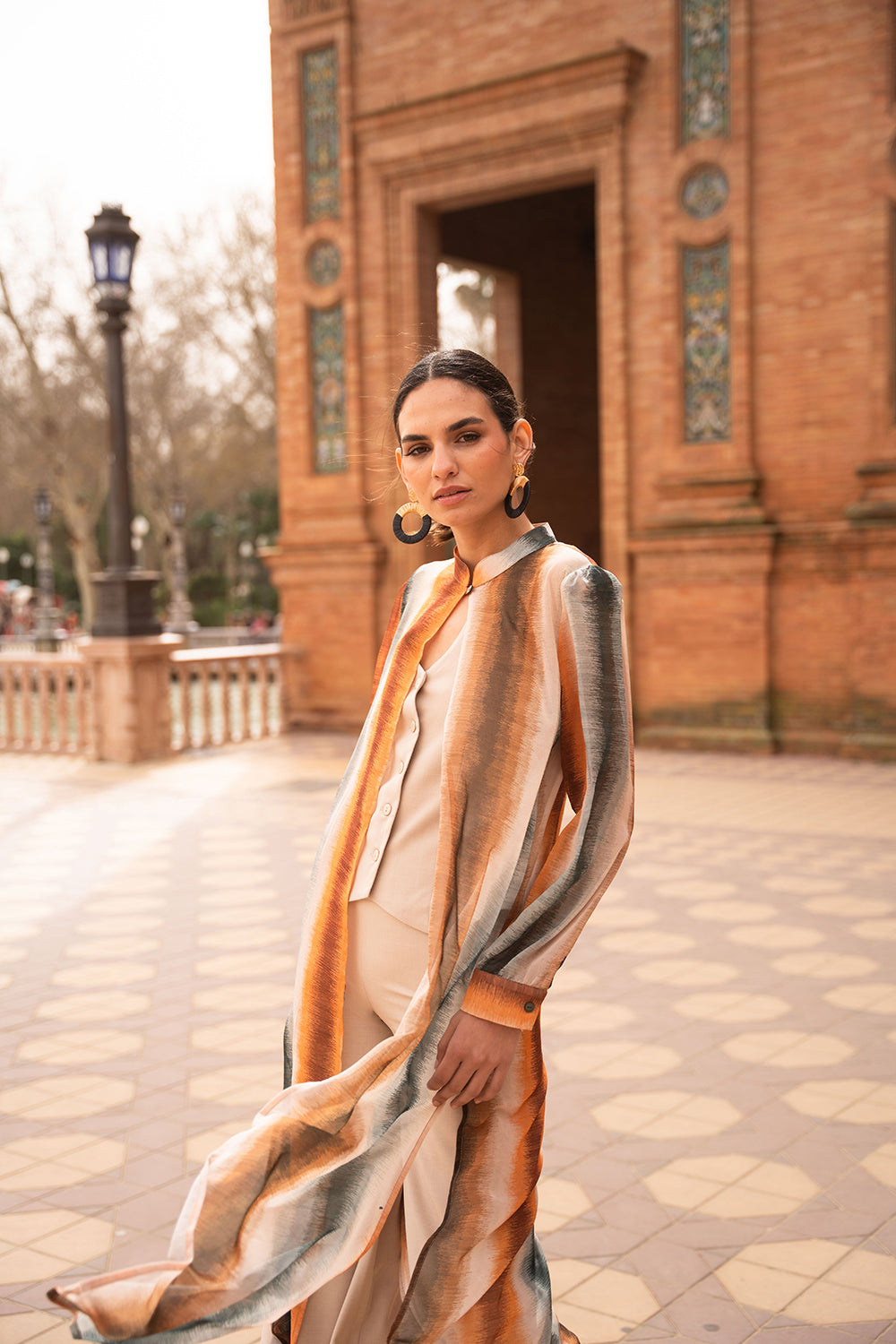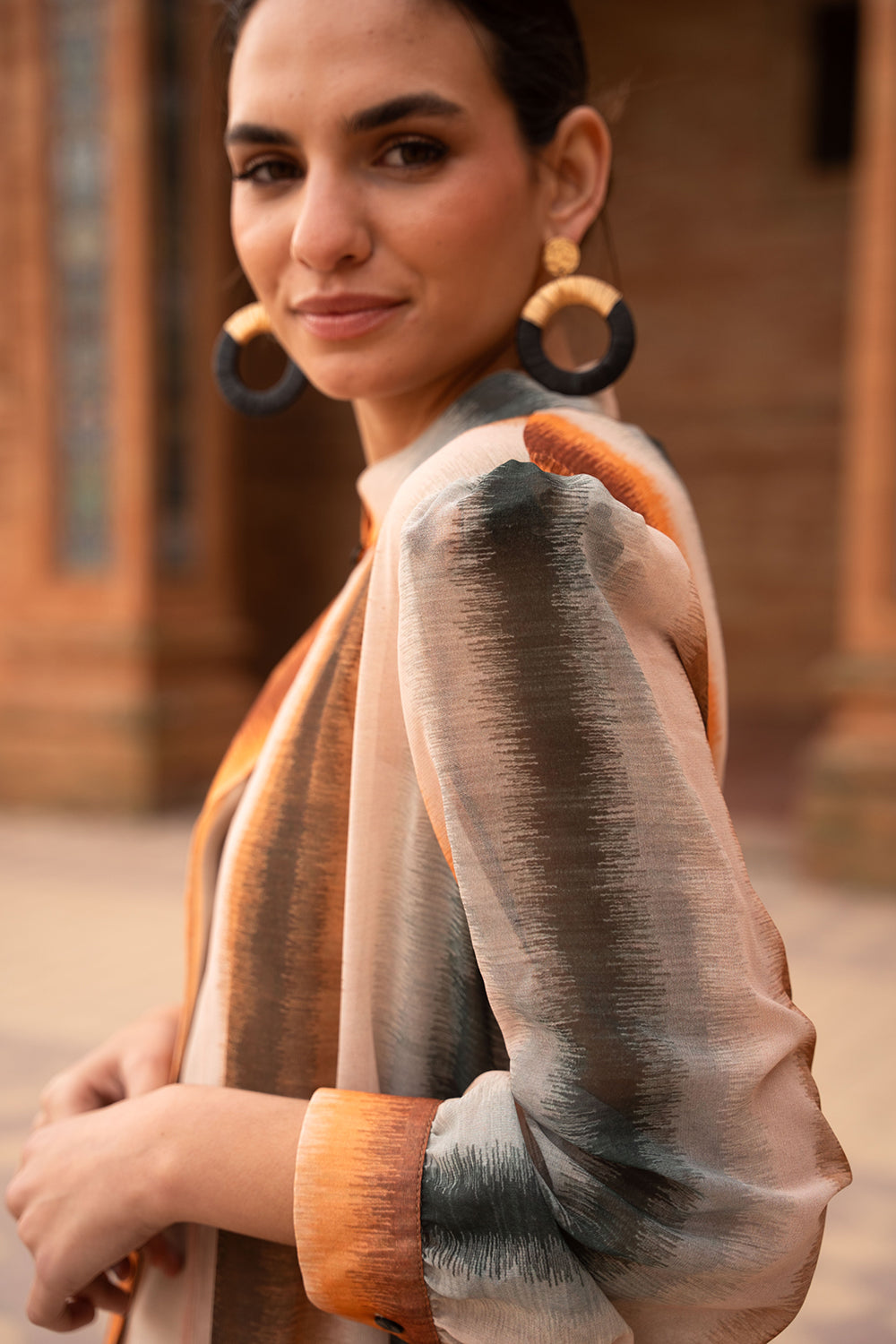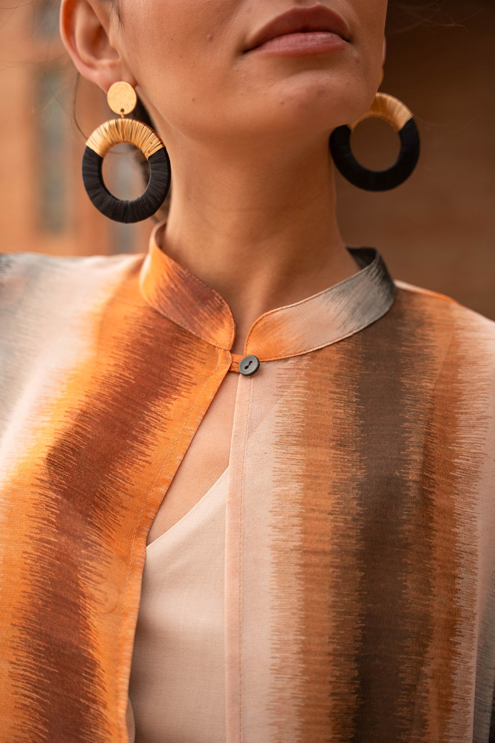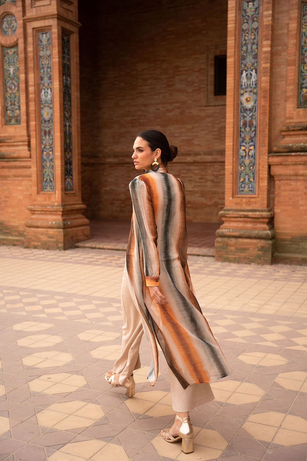 - Estampado de rayas verticales difuminadas en tonos tierra, caldero y petróleo