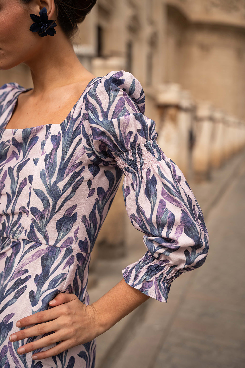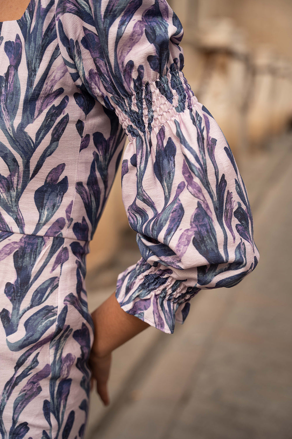 • Mangas abullonadas con detalle de ajuste mediante nido de abeja en codo y muñeca