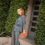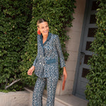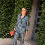 • Pantalón recto con cinturilla elástica en tejido liso a tono con el estampado