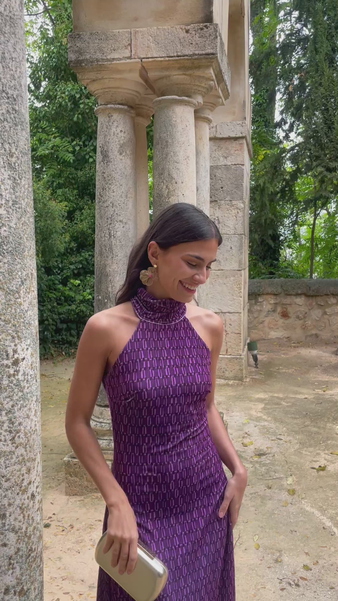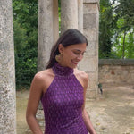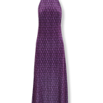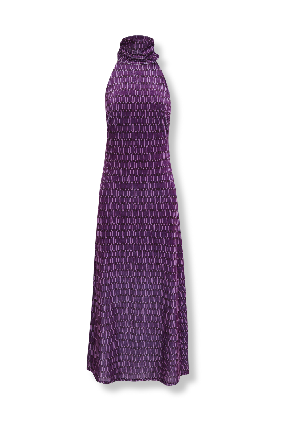 • Vestido de terciopelo con estampado geométrico en tonos morado forrado en gasa a tono.