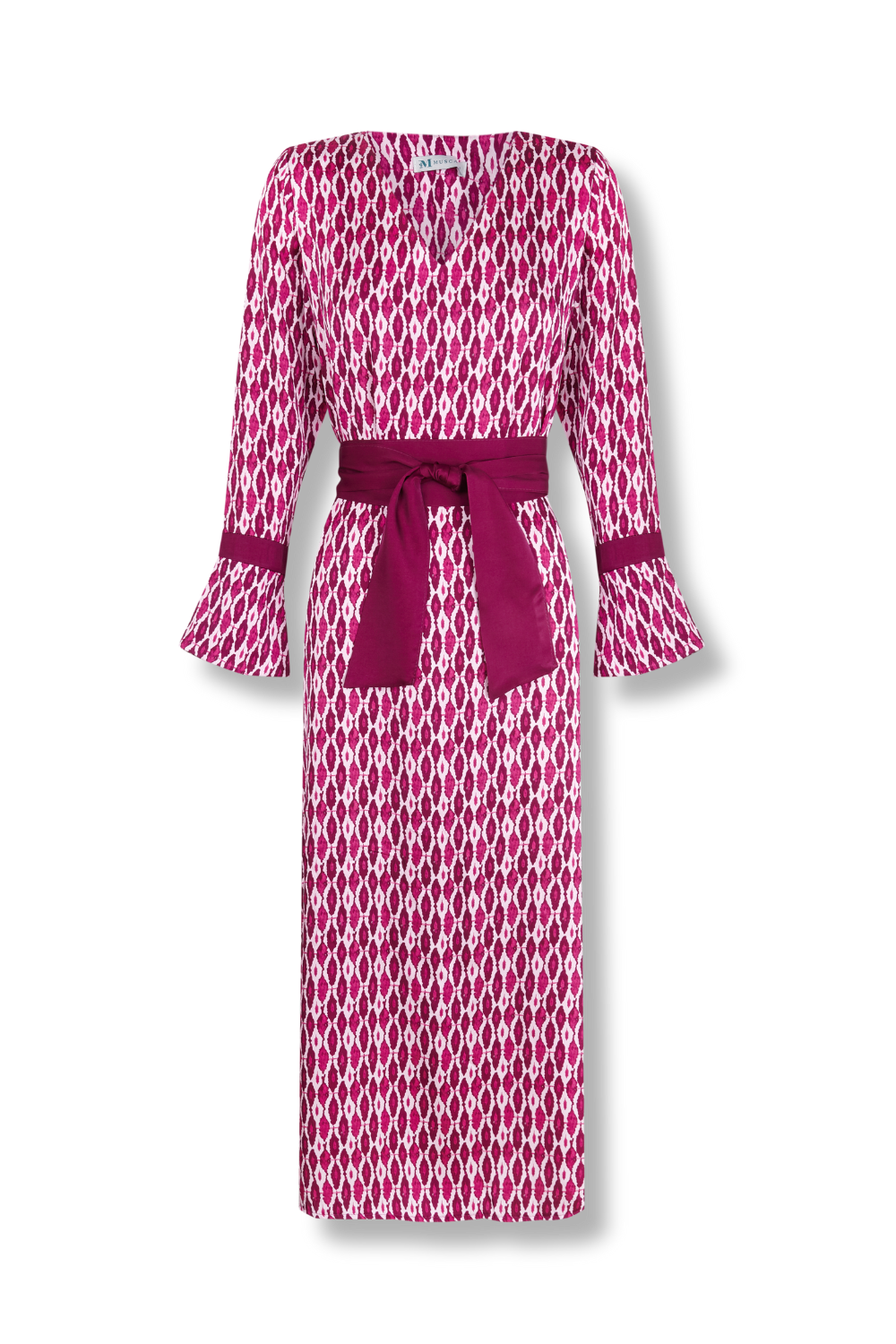 • Vestido midi de raso con escote en "uve" y detalle hombrera en tonos rosa