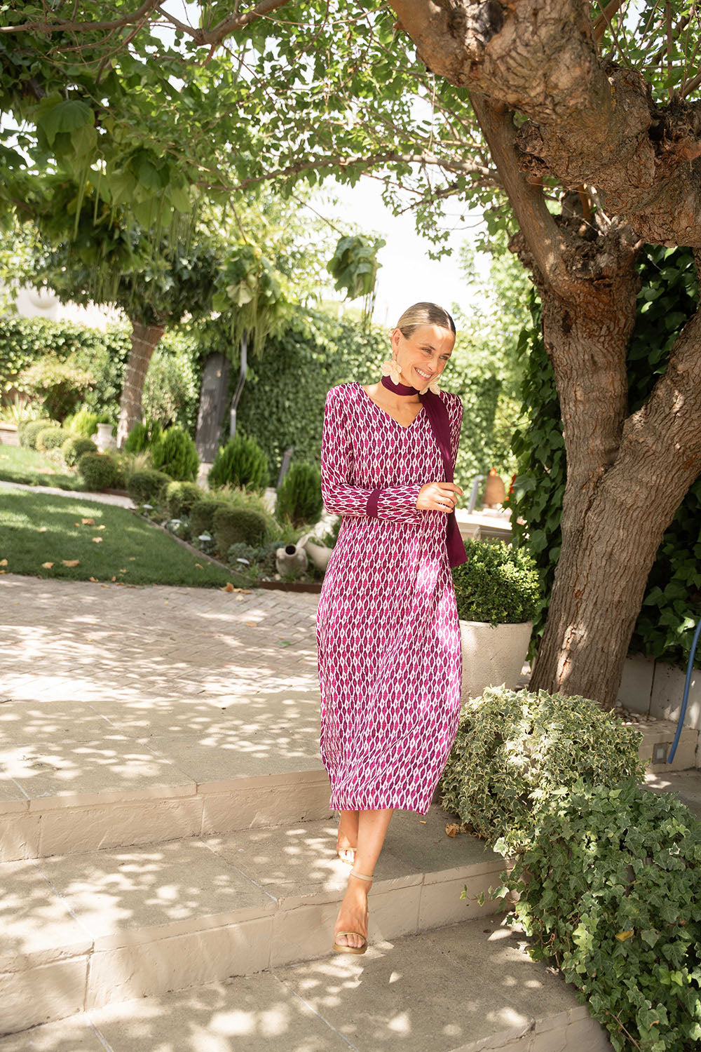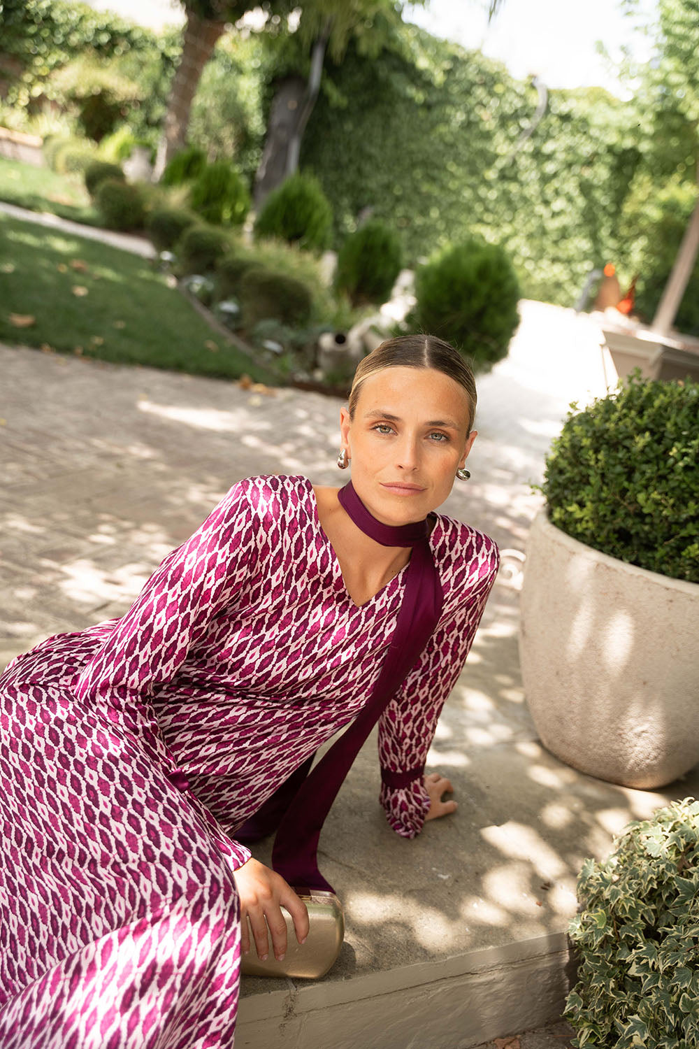 • Lleva un fajín que puedes usar en el cuello o en la cintura, en tono liso a juego con el vestido.