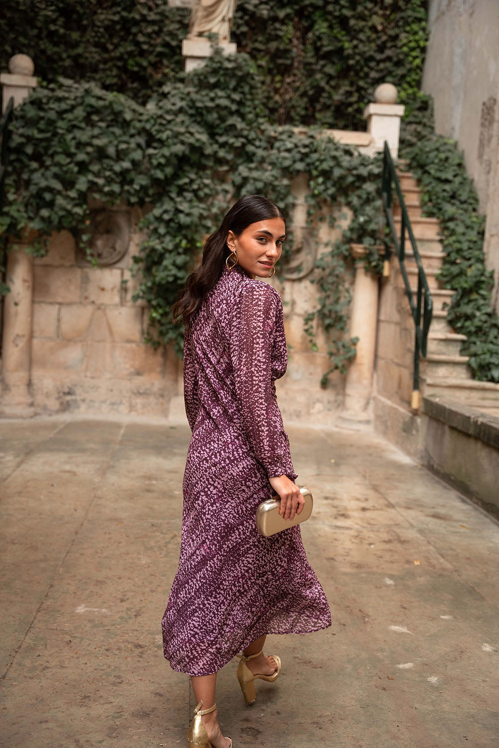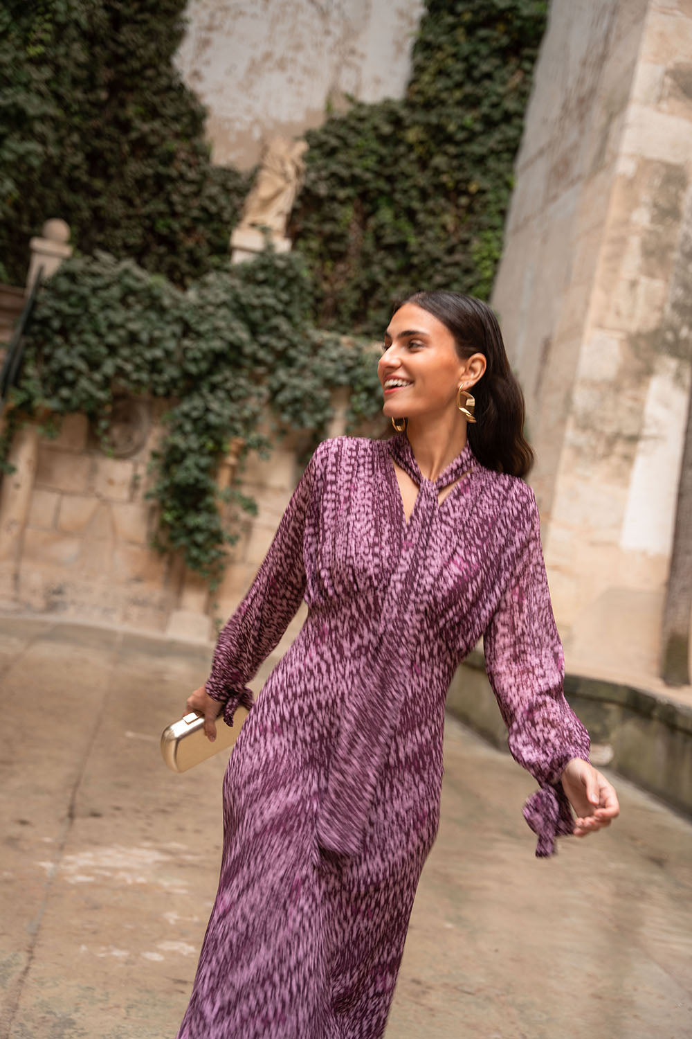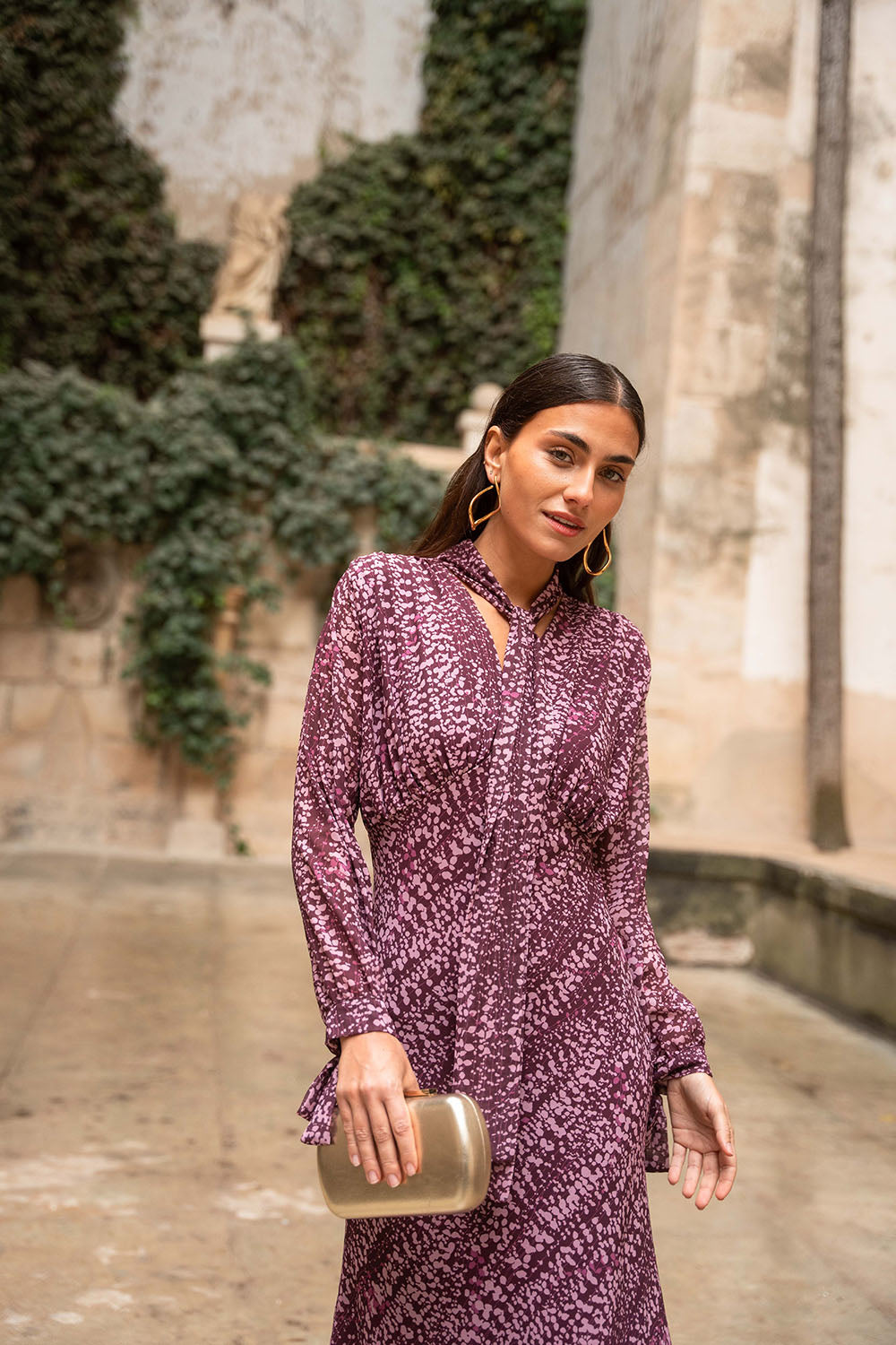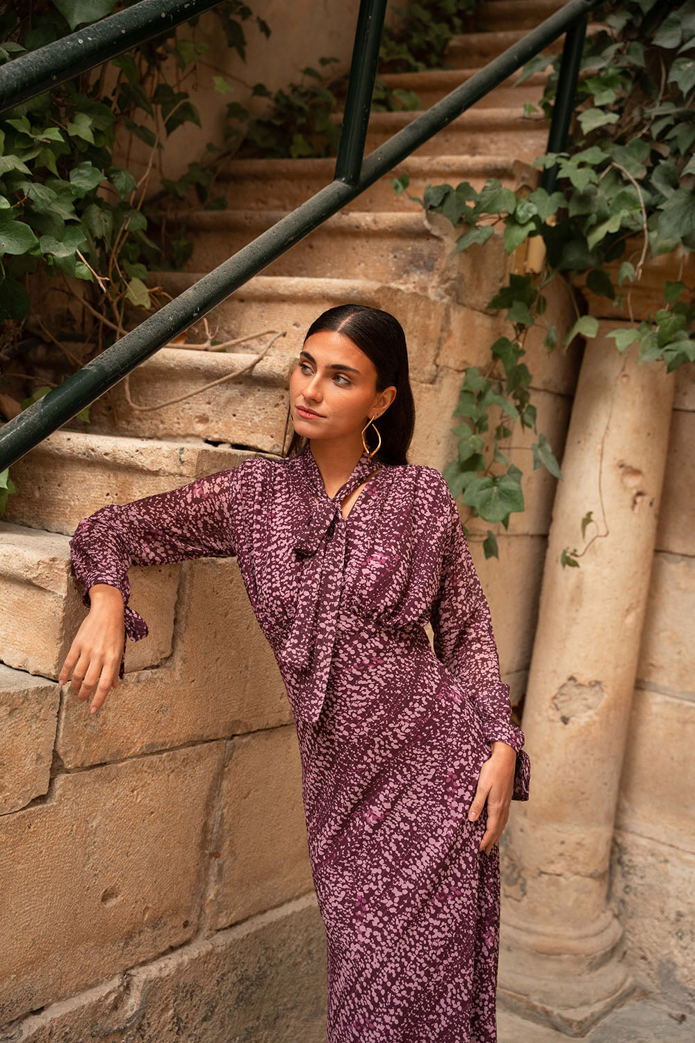 • Vestido de gasa con estampado de manchas en tonos berenjena forrado a tono.