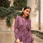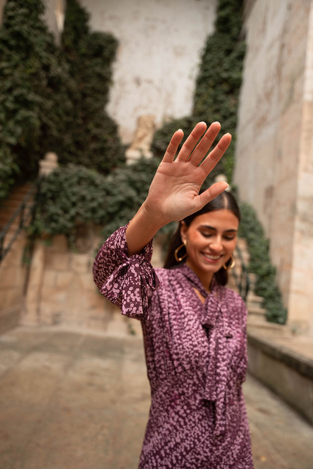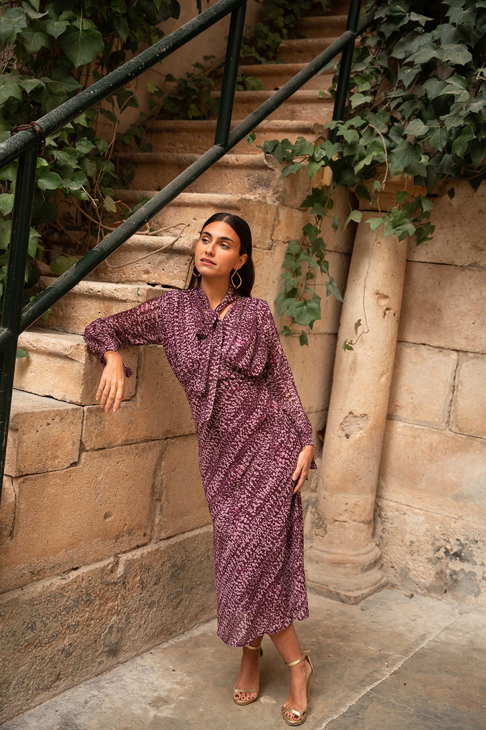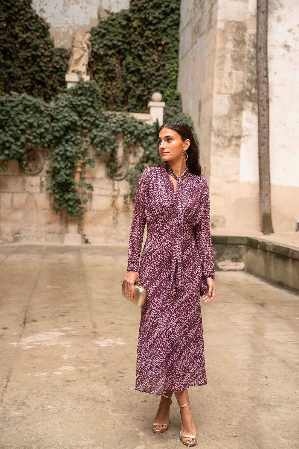 • Vestido de gasa con estampado de manchas en tonos berenjena forrado a tono.