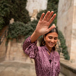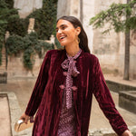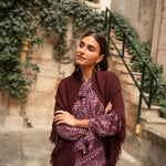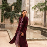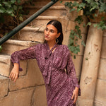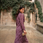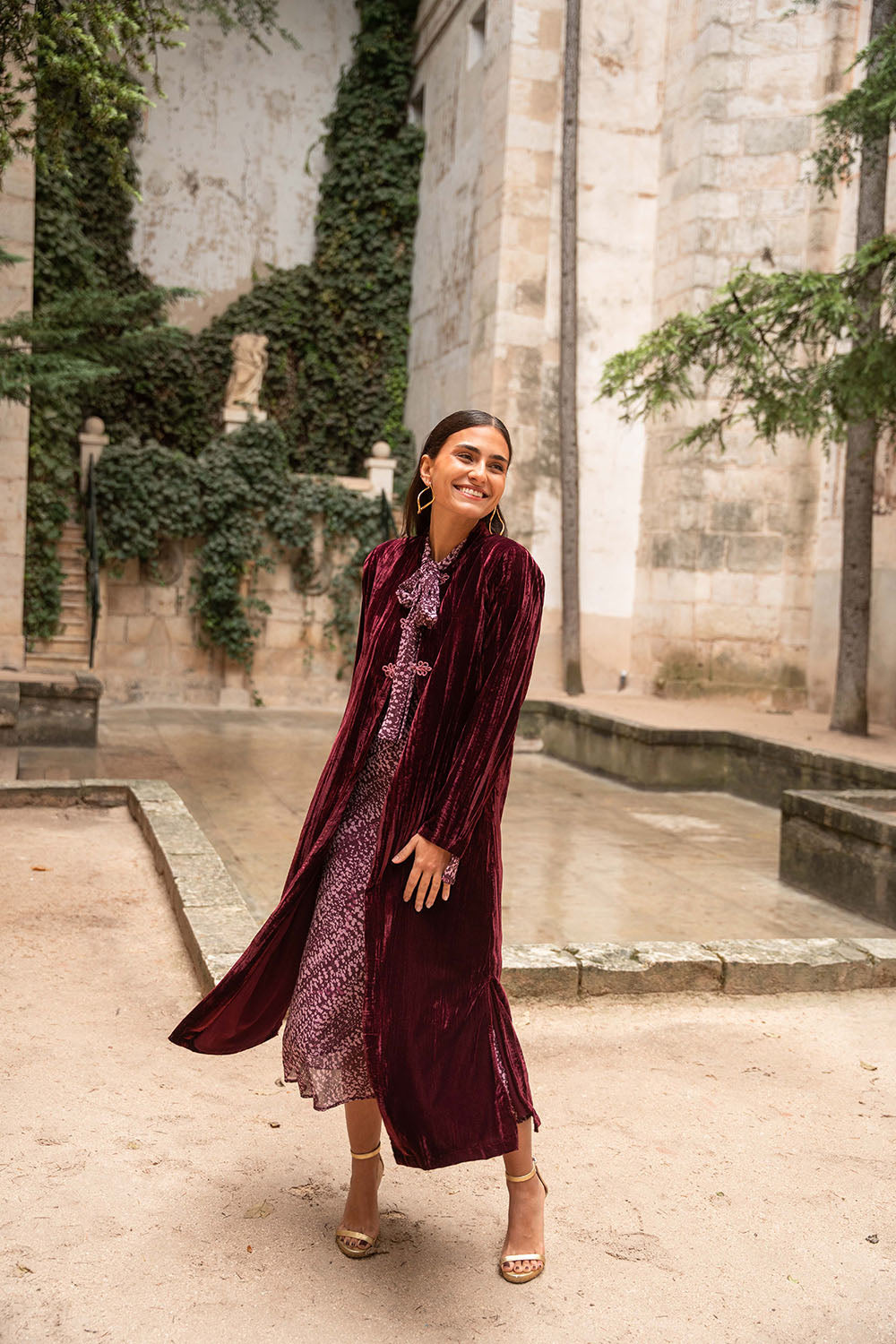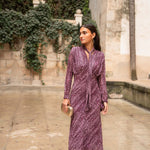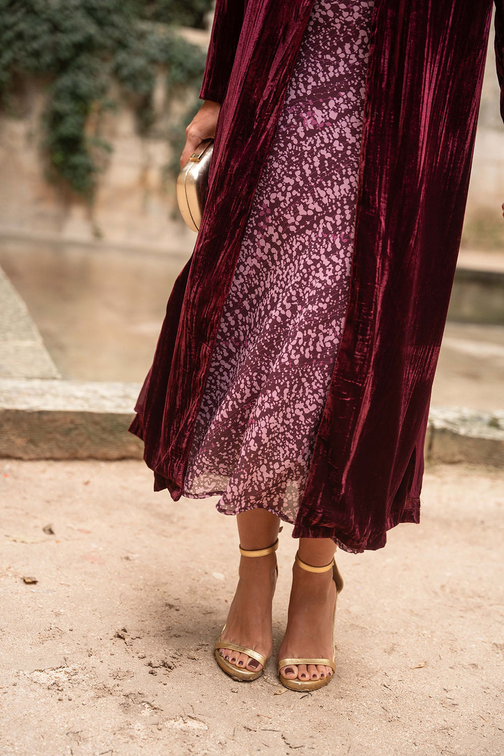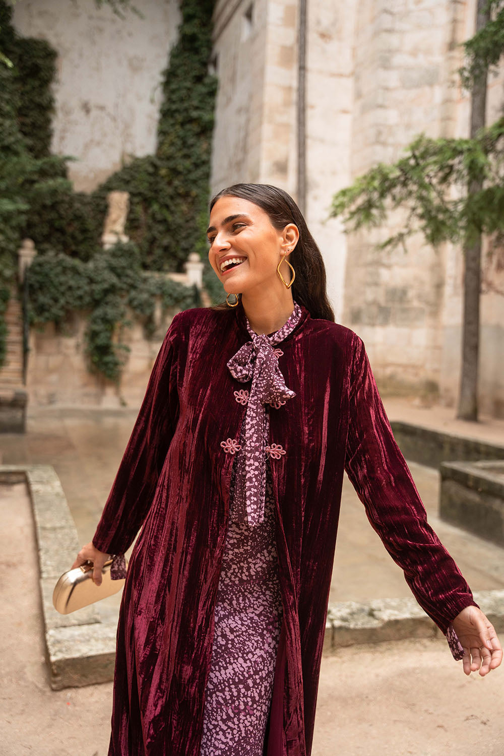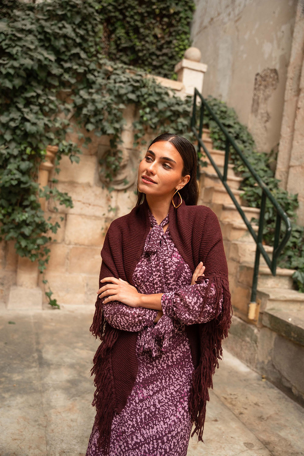 • Vestido de gasa con estampado de manchas en tonos berenjena forrado a tono.