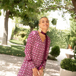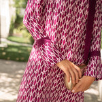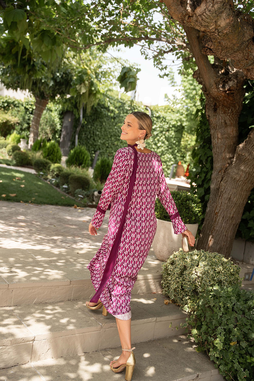 • Además, la manga es acampanada y lleva el detalle de una tira en tono liso en la muñeca