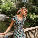 • Vestido midi con estampado geométrico en tonos verdes y azules