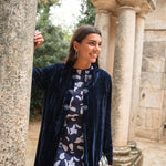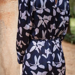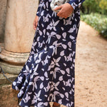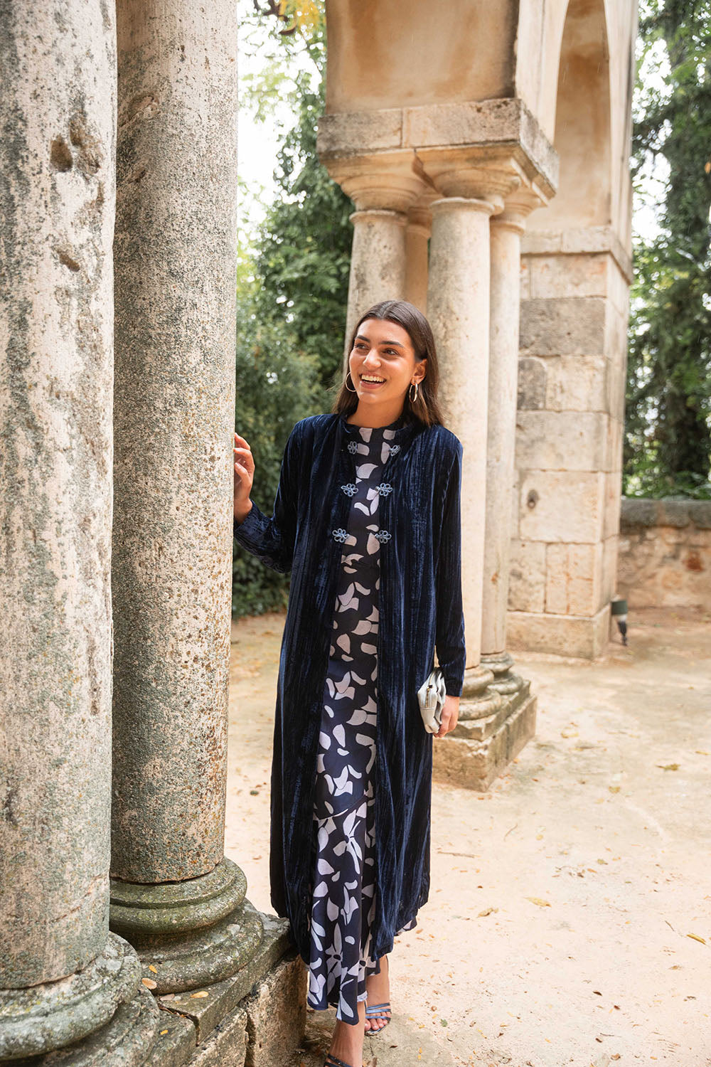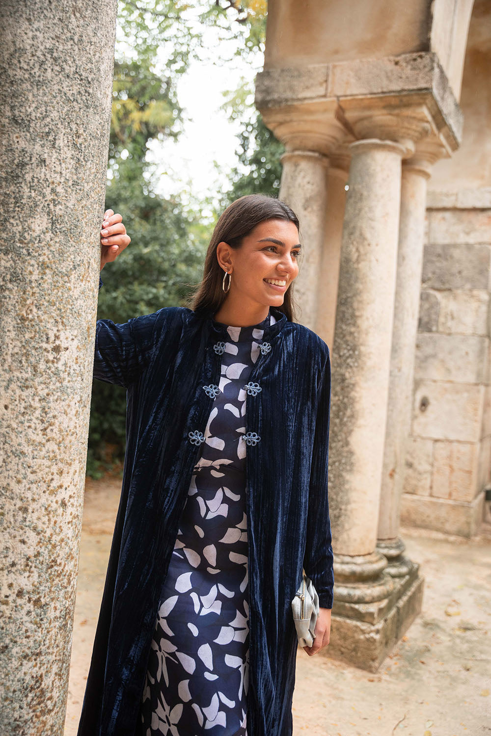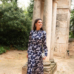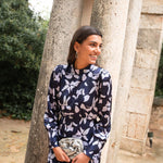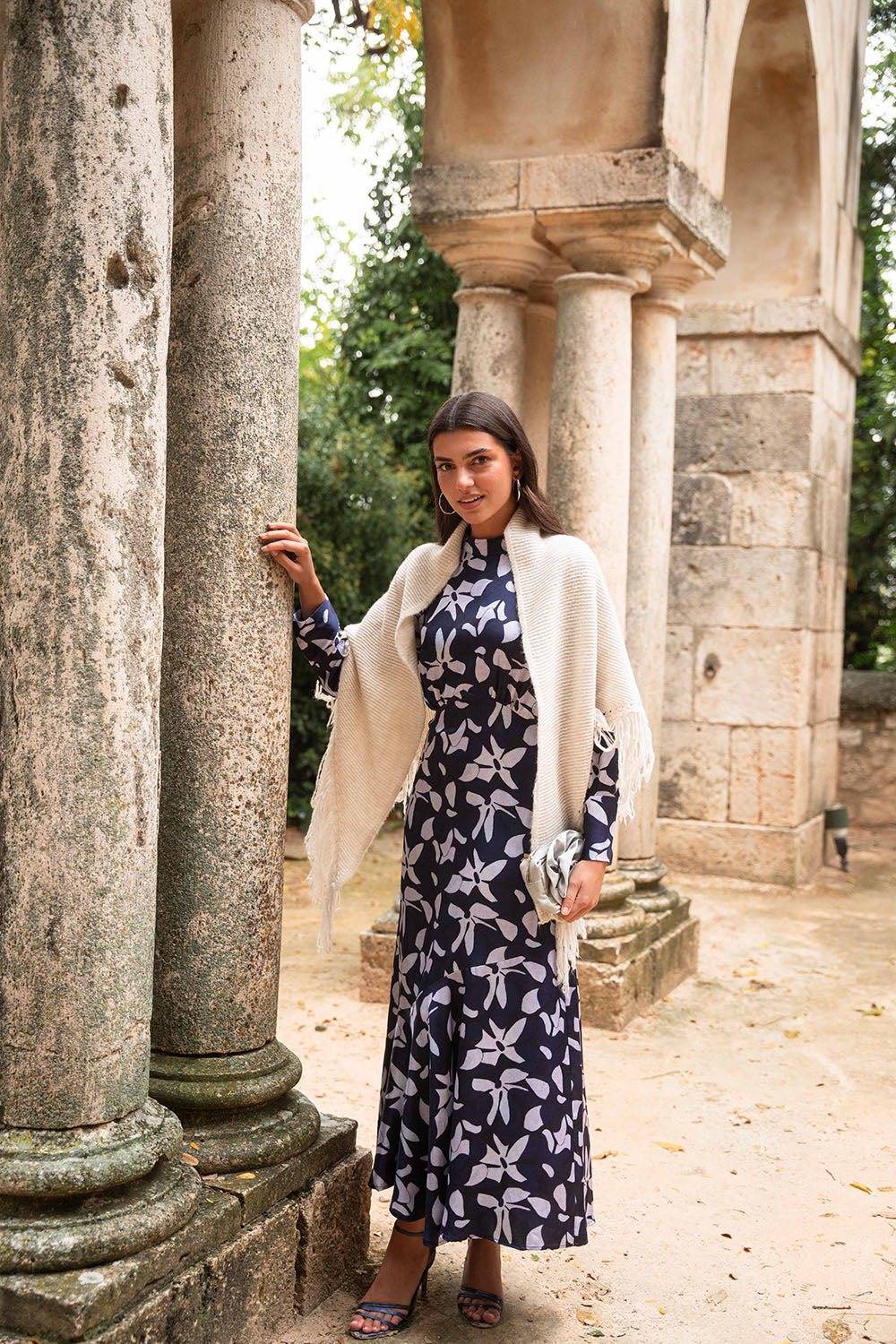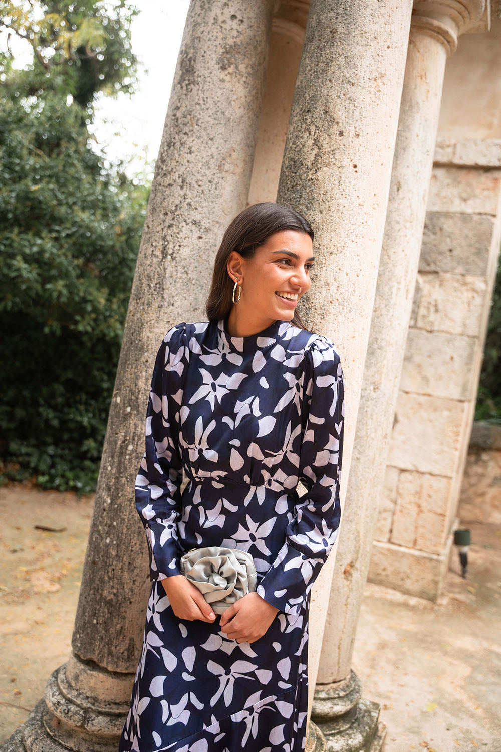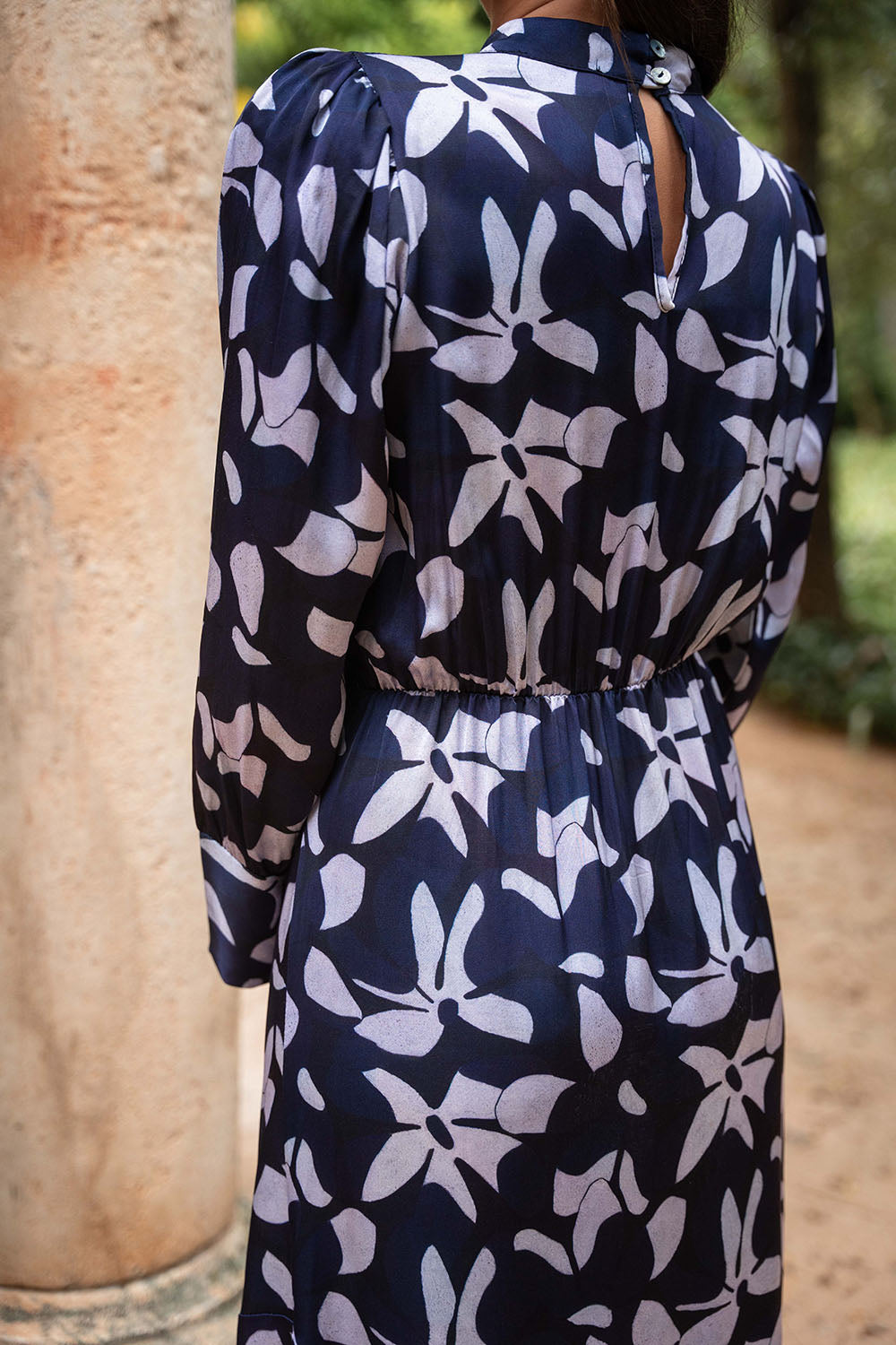 • Vestido de raso con estampado de maxi flor en tonos azules.