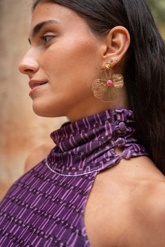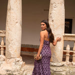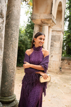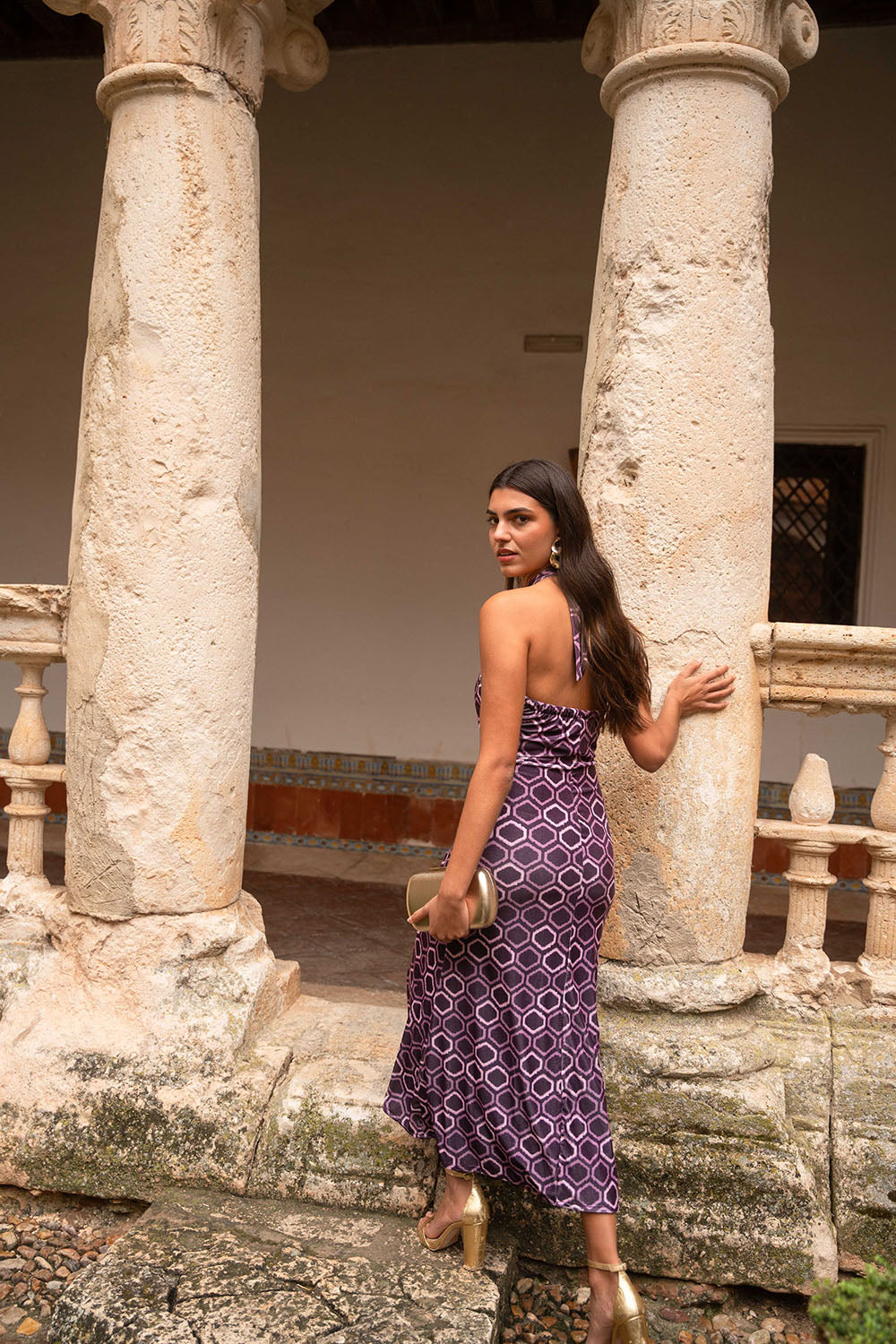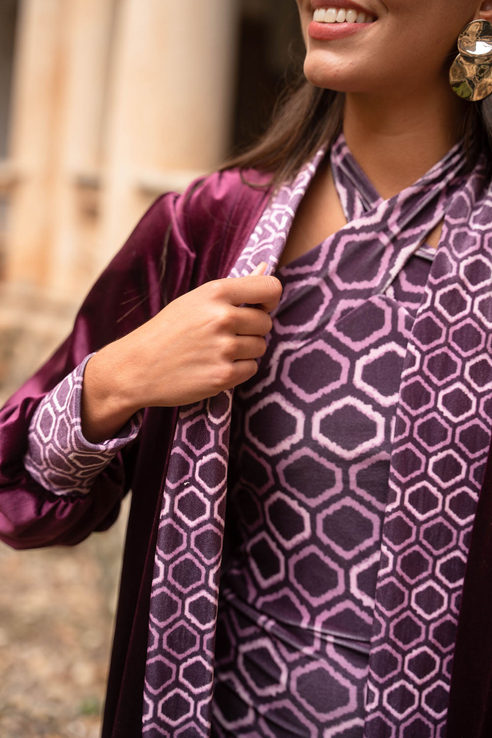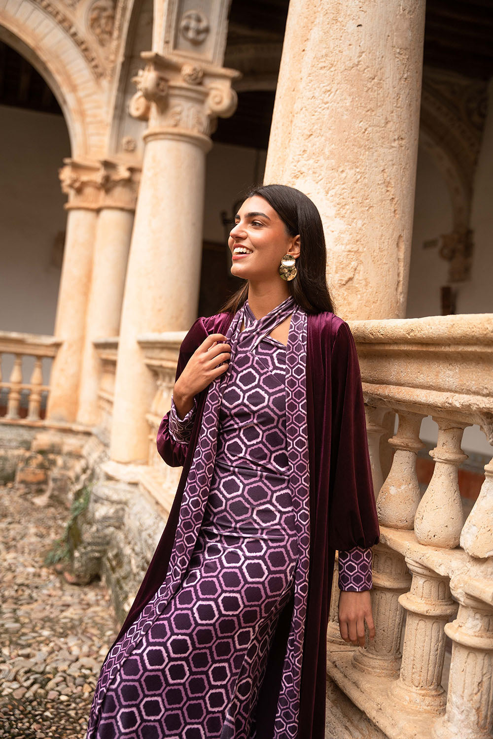 • Vestido de terciopelo con estampado geométrico en tonos berenjena.