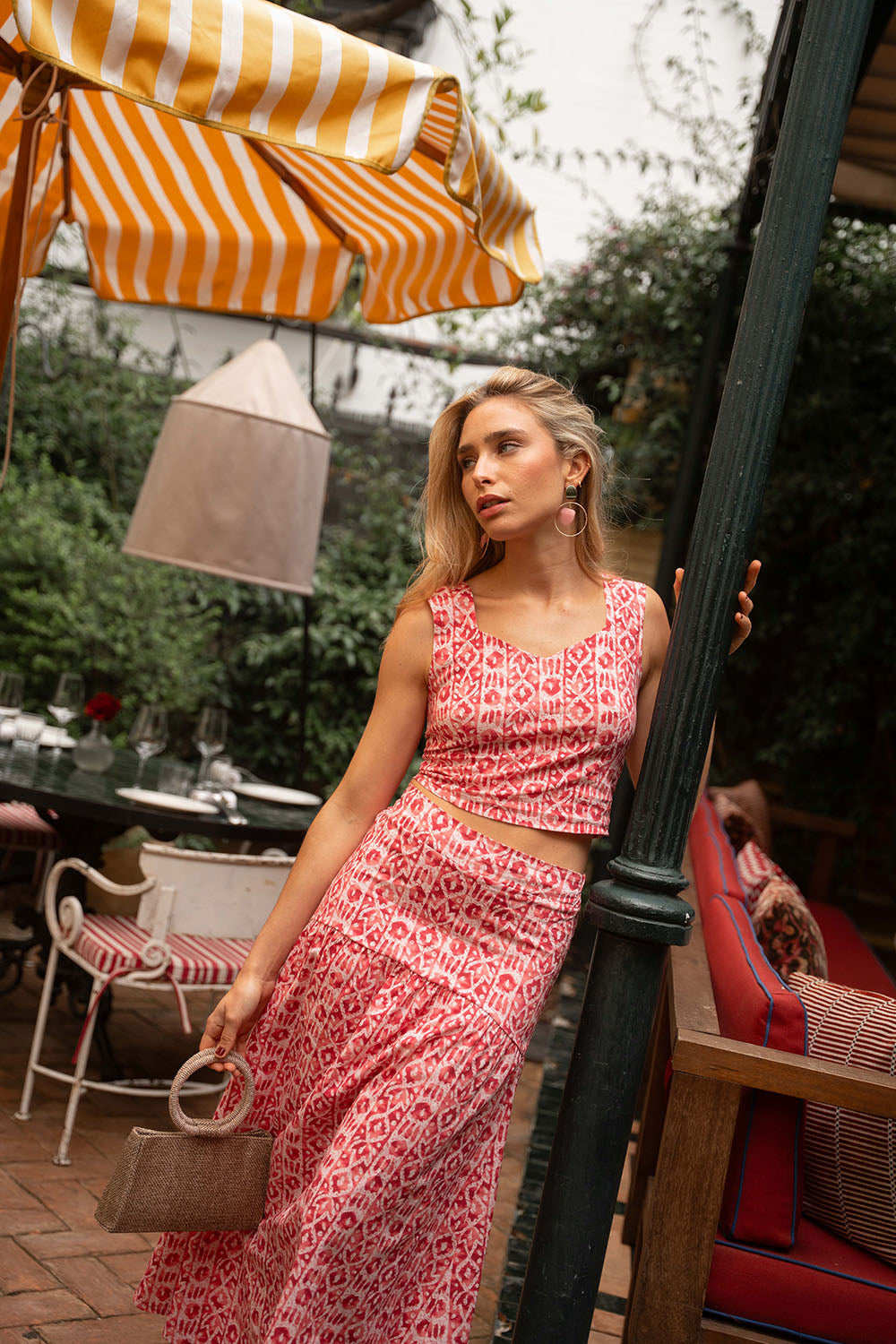 • Midi skirt fitted between the waist and hip, flared from the hip.