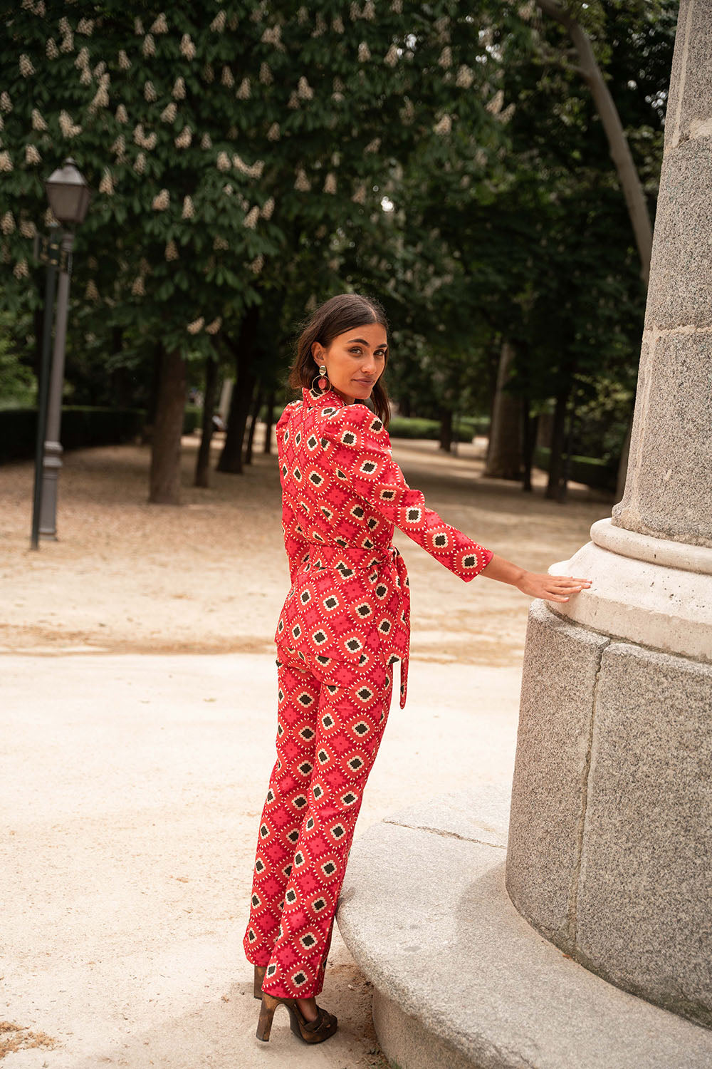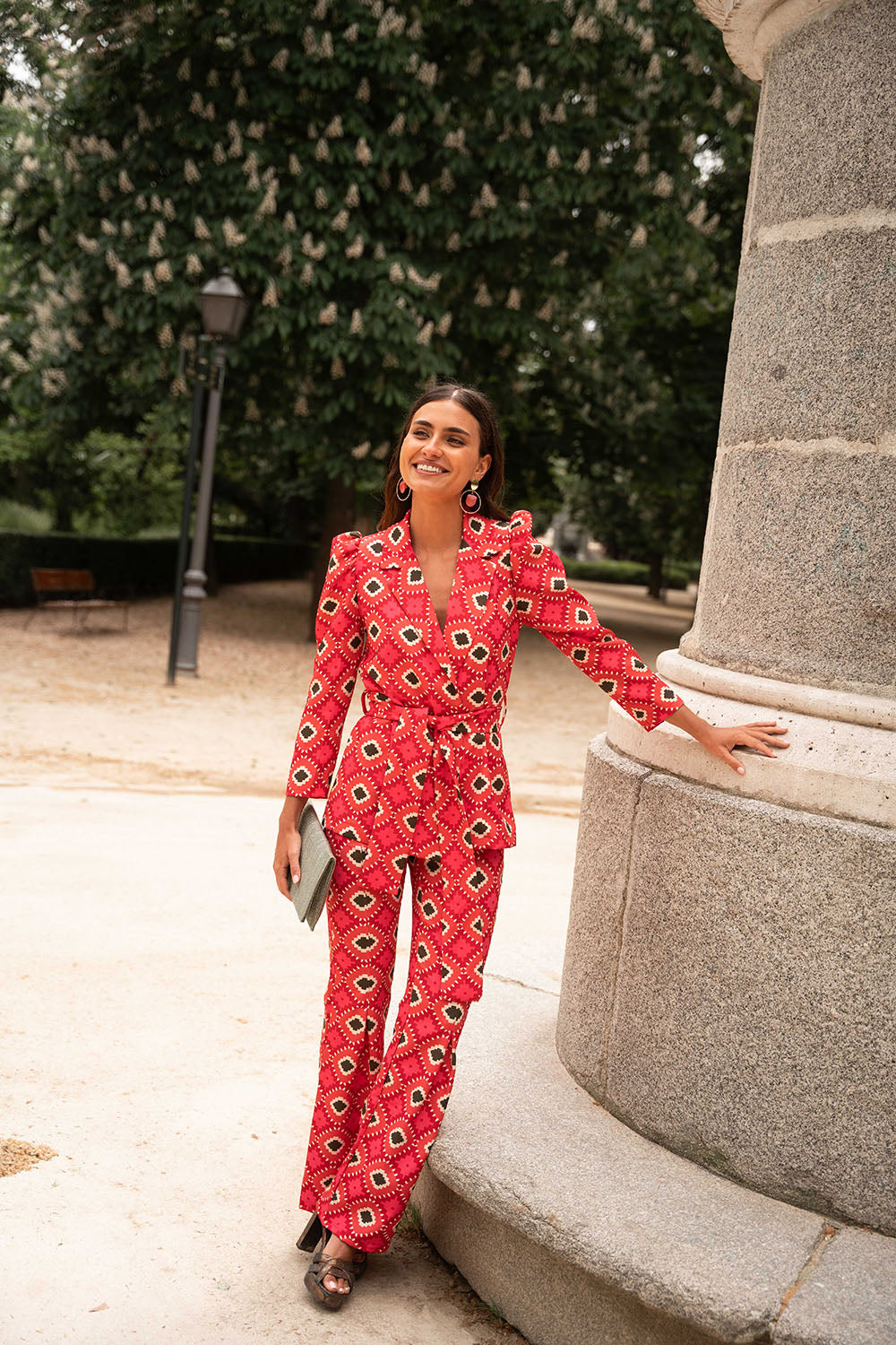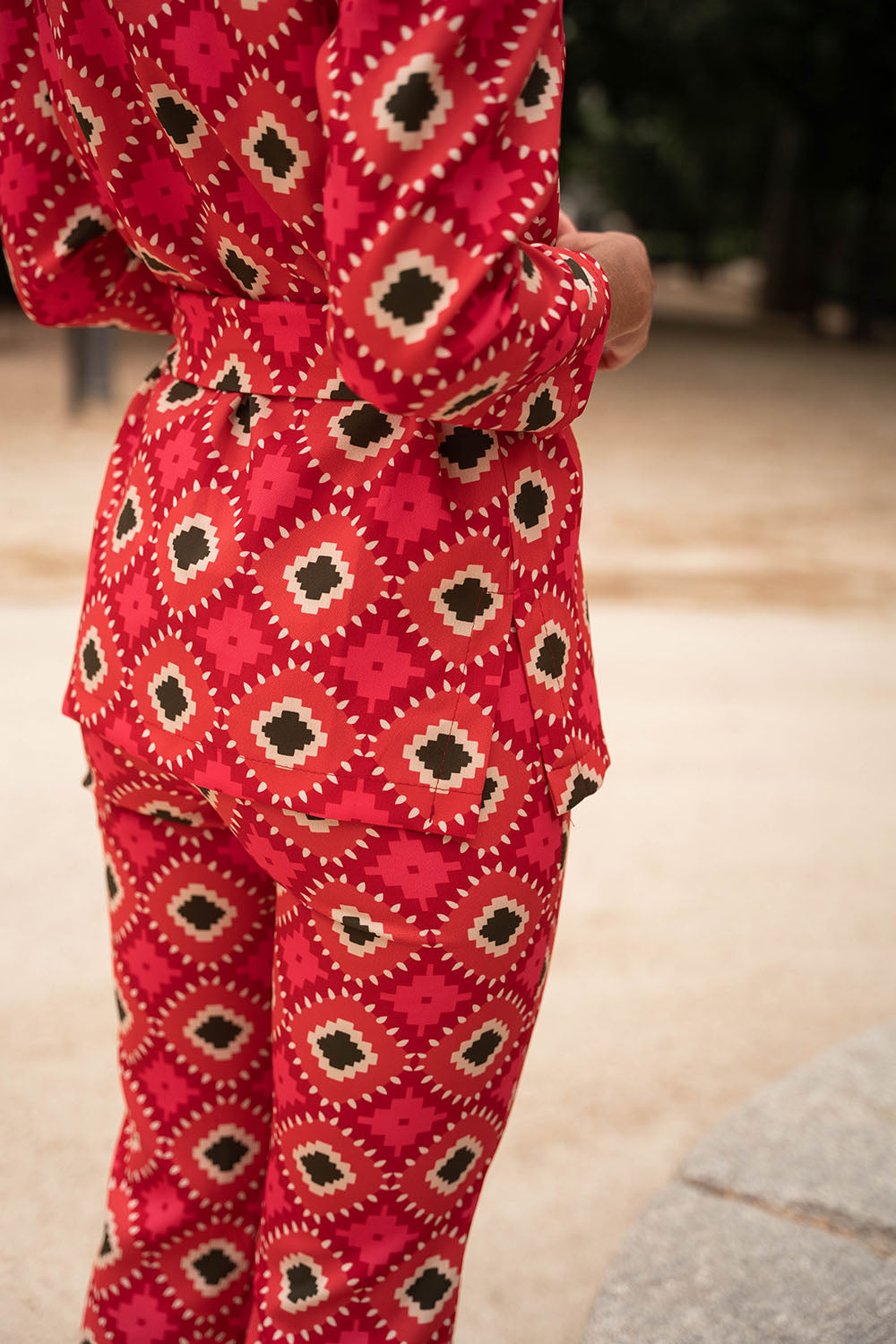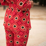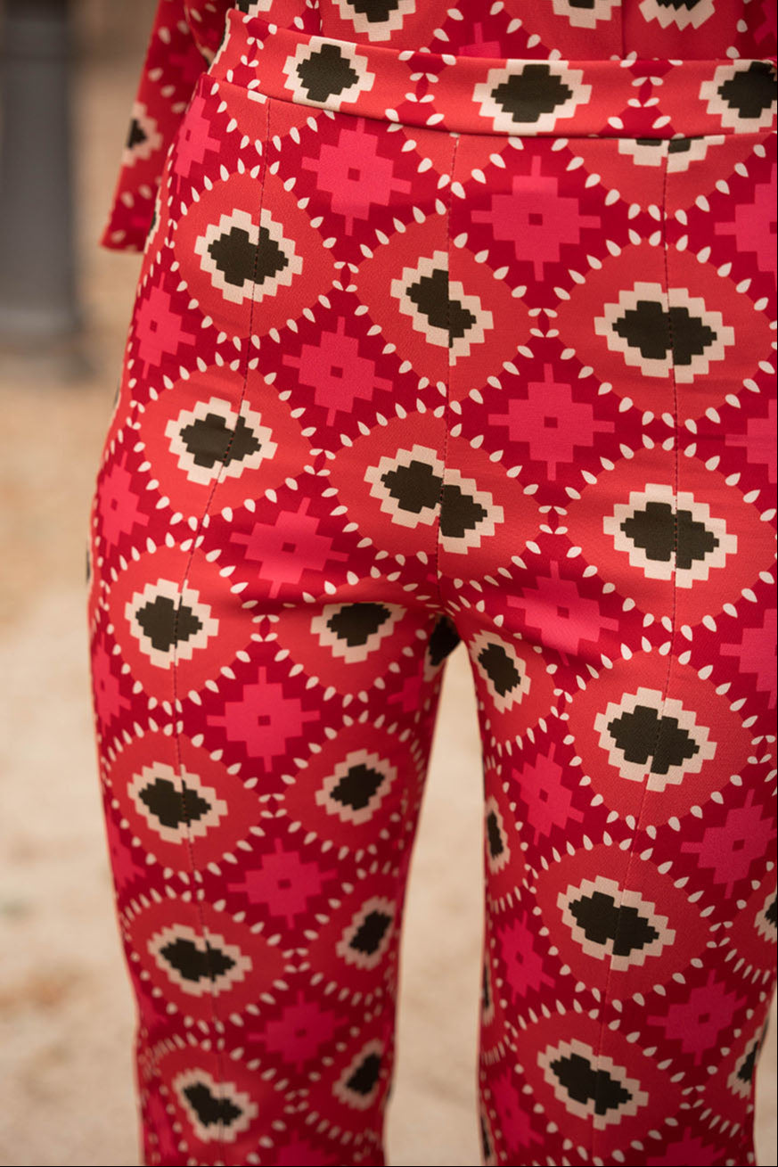 • Geometric print in red with green details