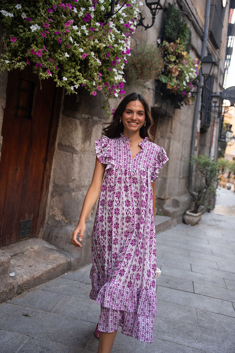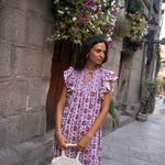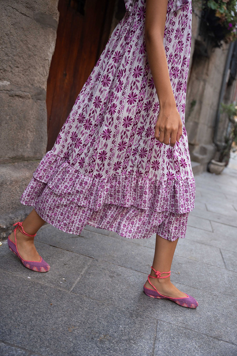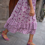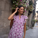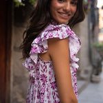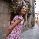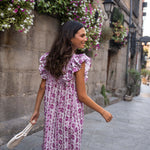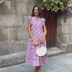 • Vestido midi estampado en tonos buganvilla, con contraste entre los tamaños de los estampados.