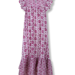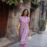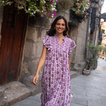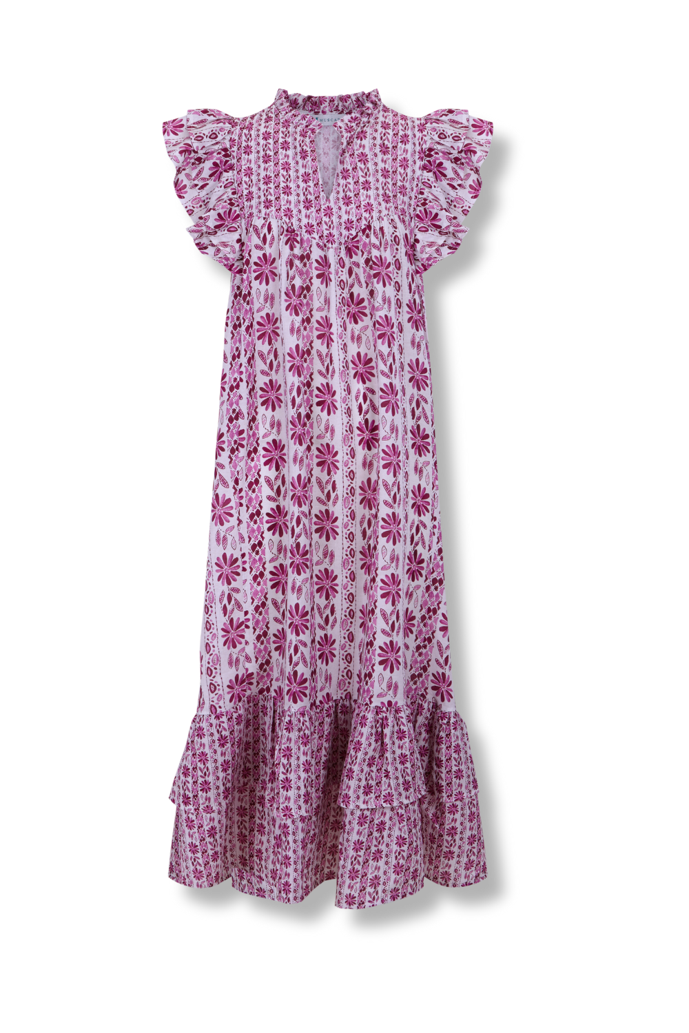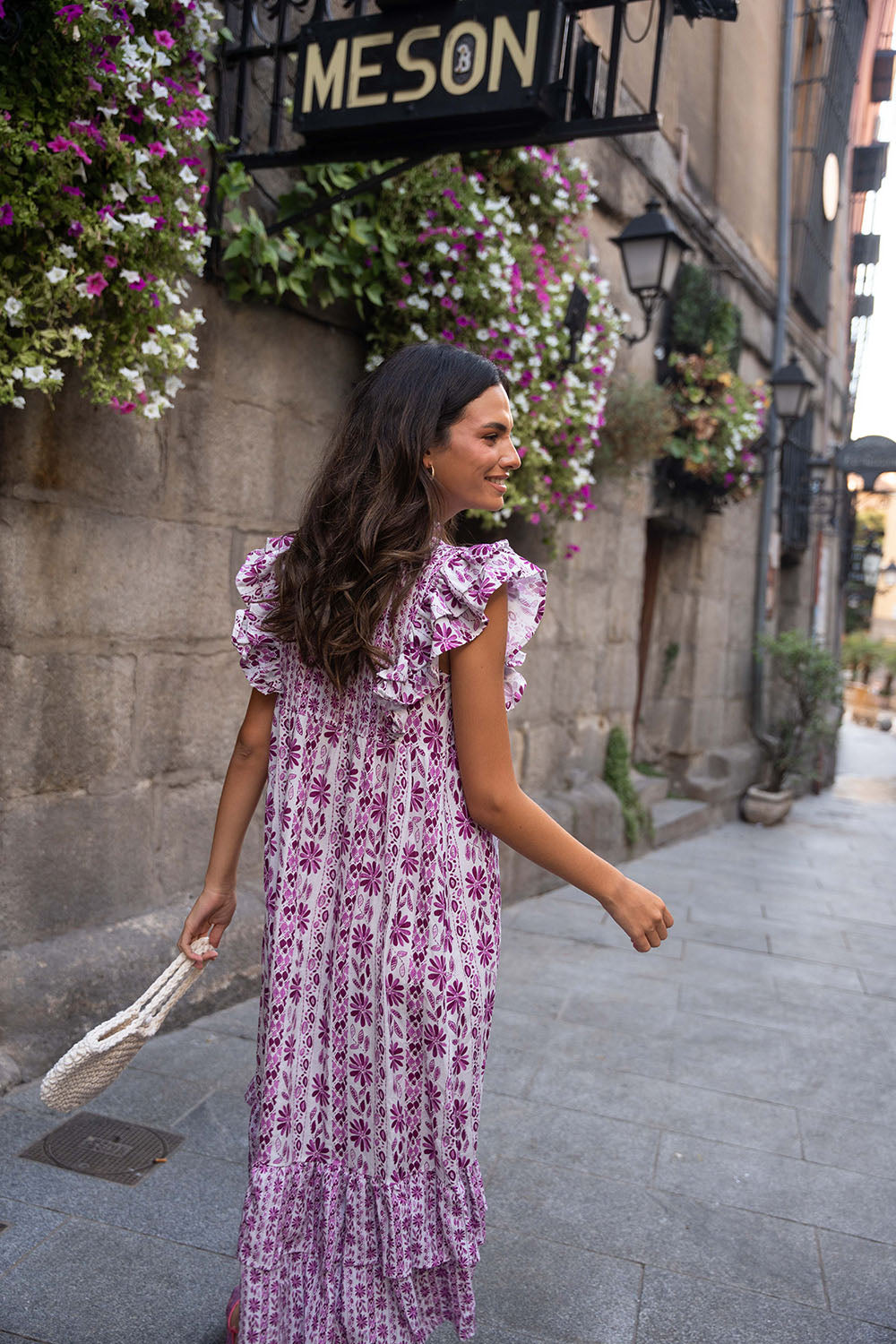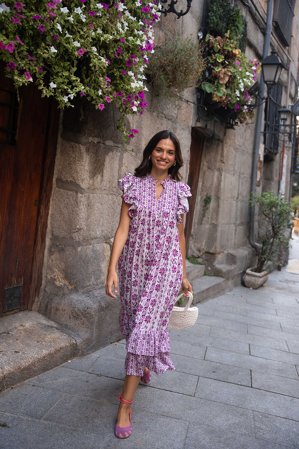 • Vestido midi estampado en tonos buganvilla, con contraste entre los tamaños de los estampados.
