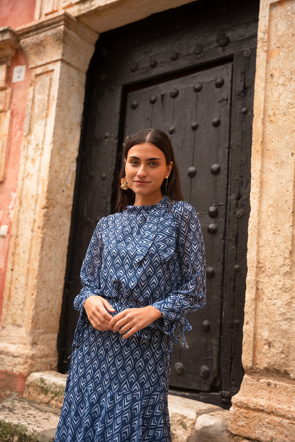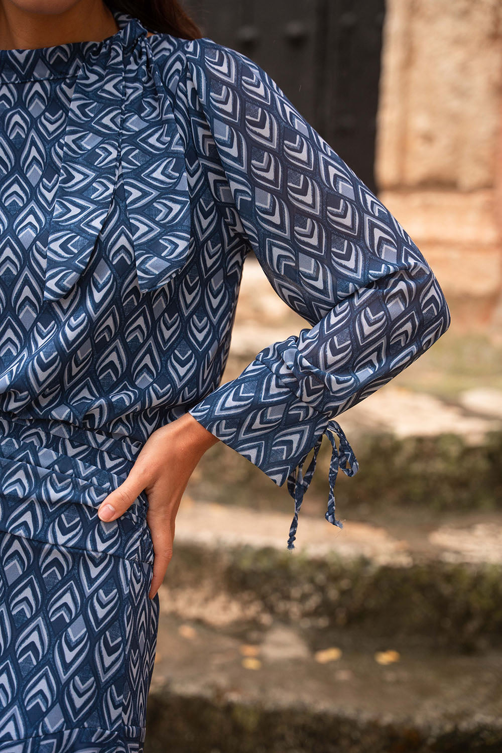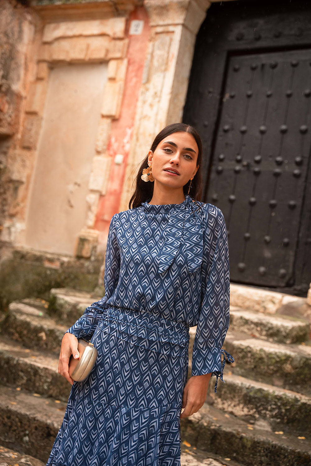 • Blusa de gasa con estampado en tonos azules y forrada a tono.