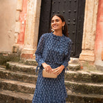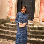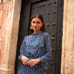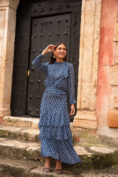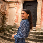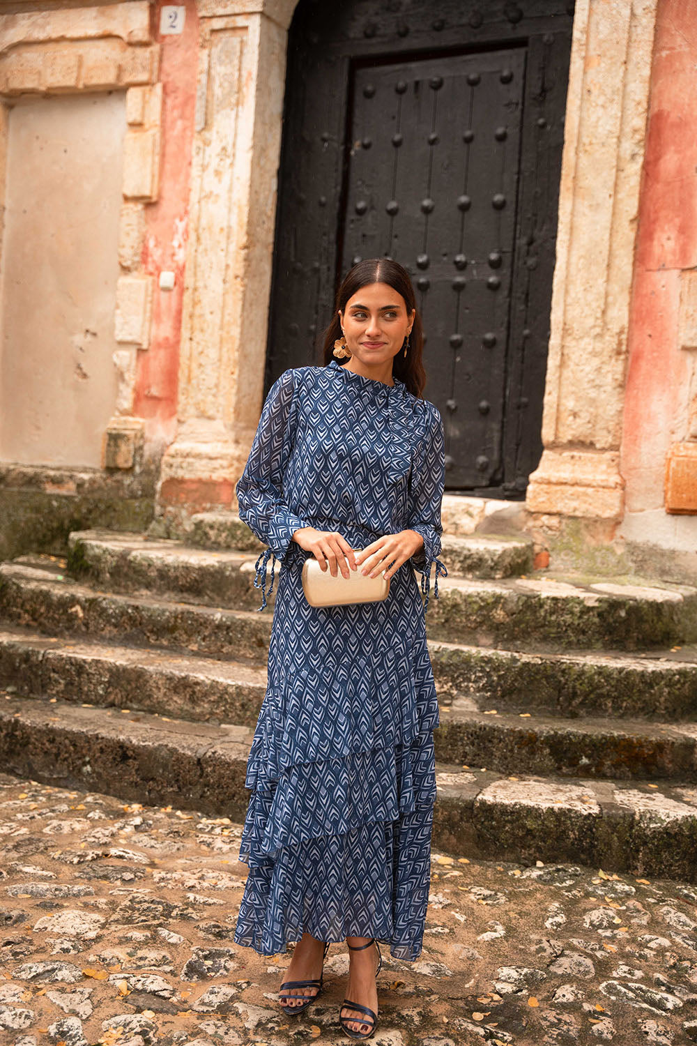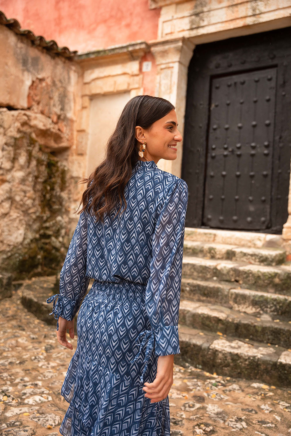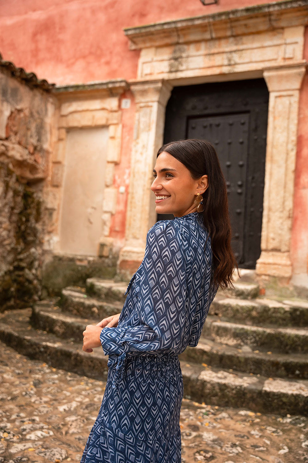 • Blusa de gasa con estampado en tonos azules y forrada a tono.