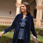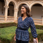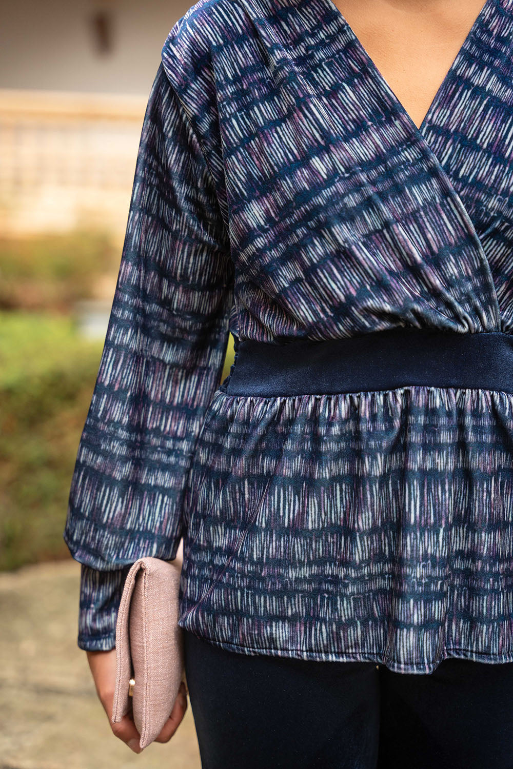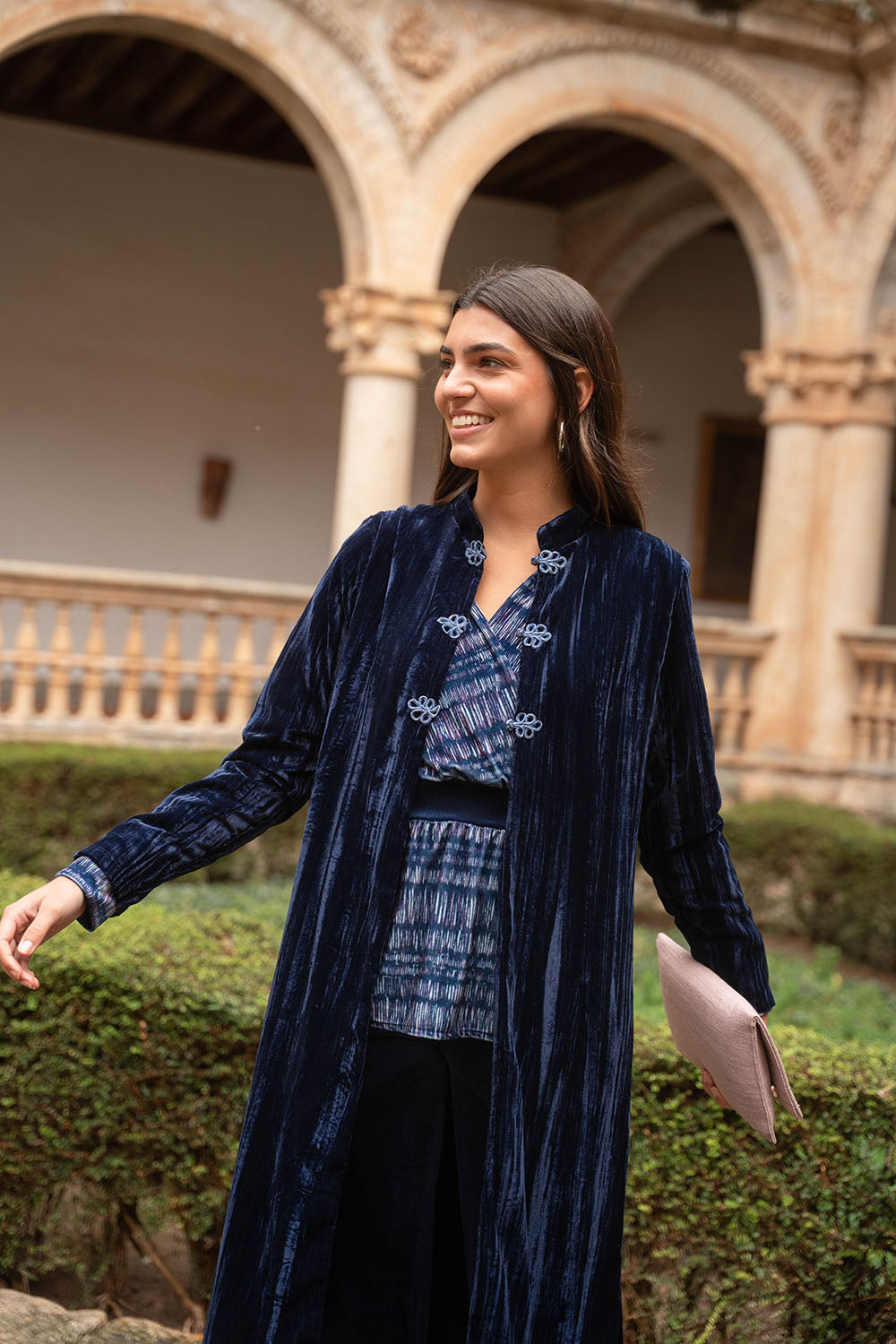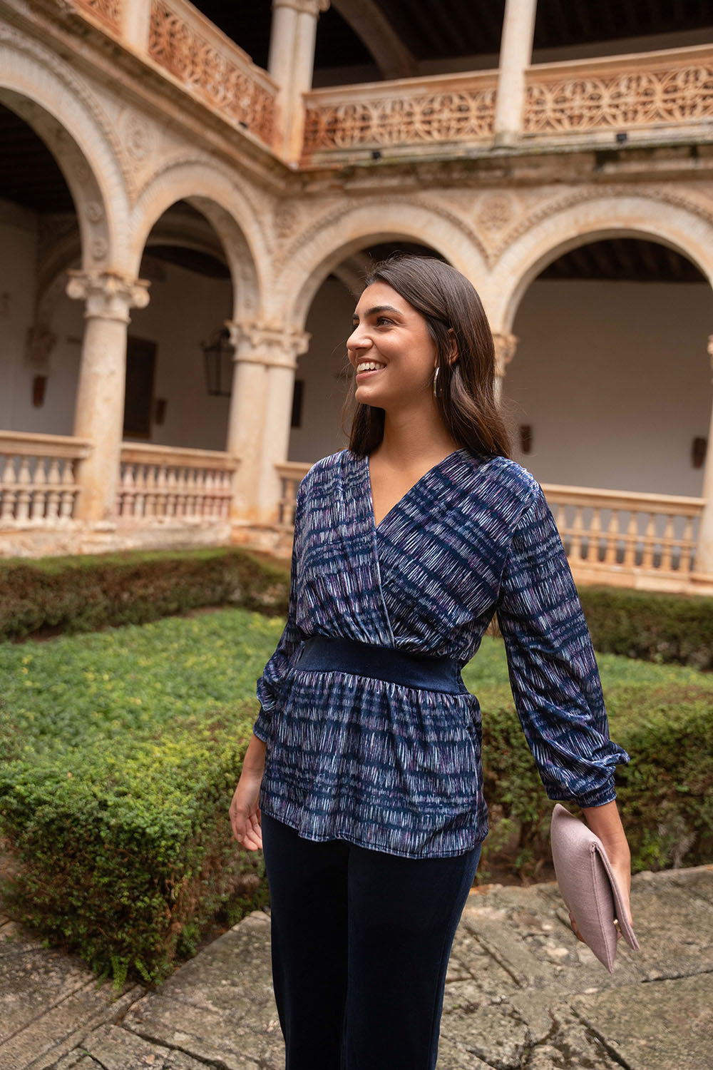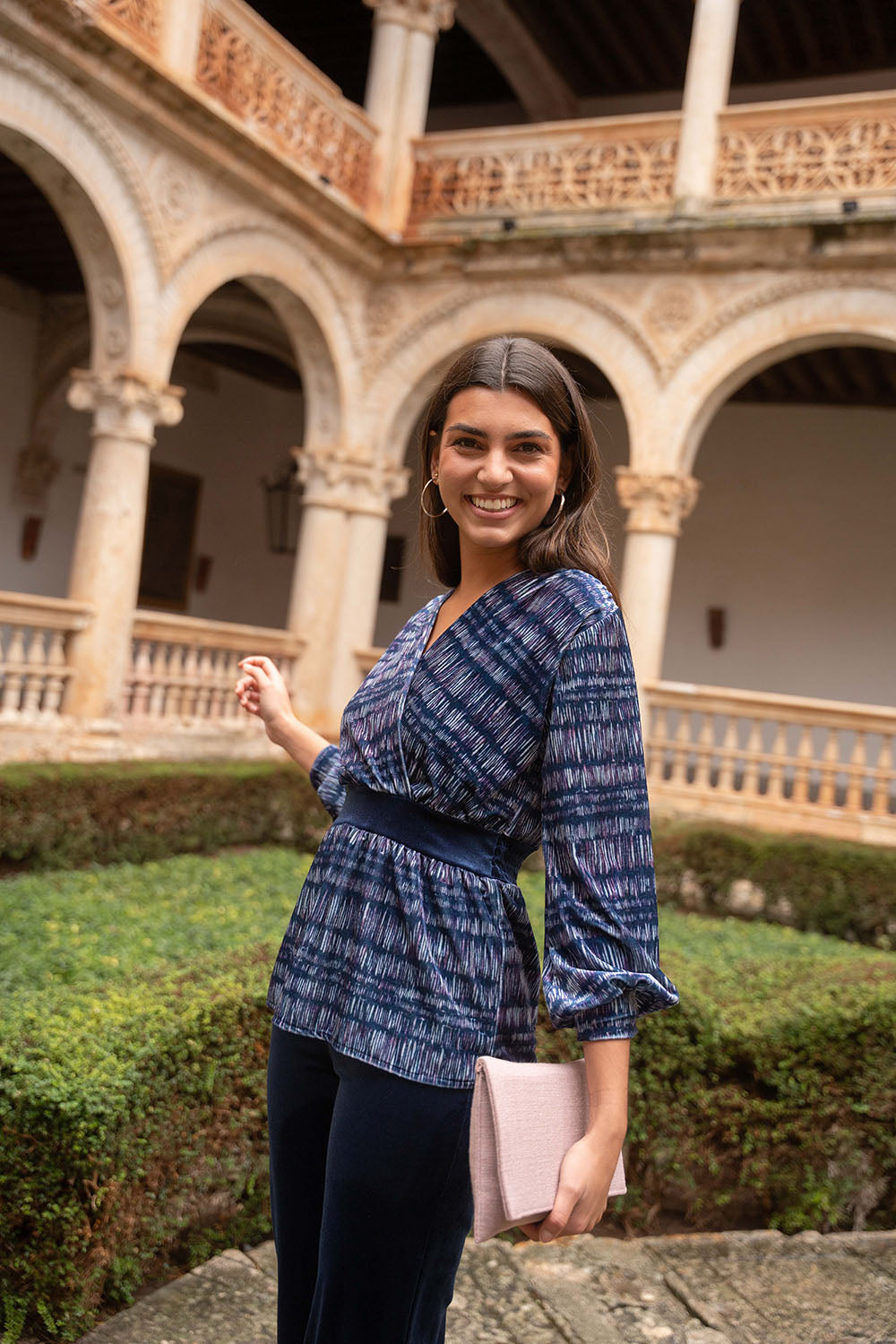 • Blusa de terciopelo con estampado en tonos azules y un toque rosa bebé.