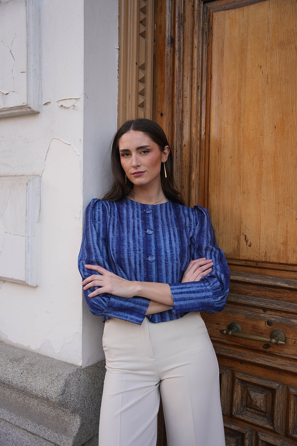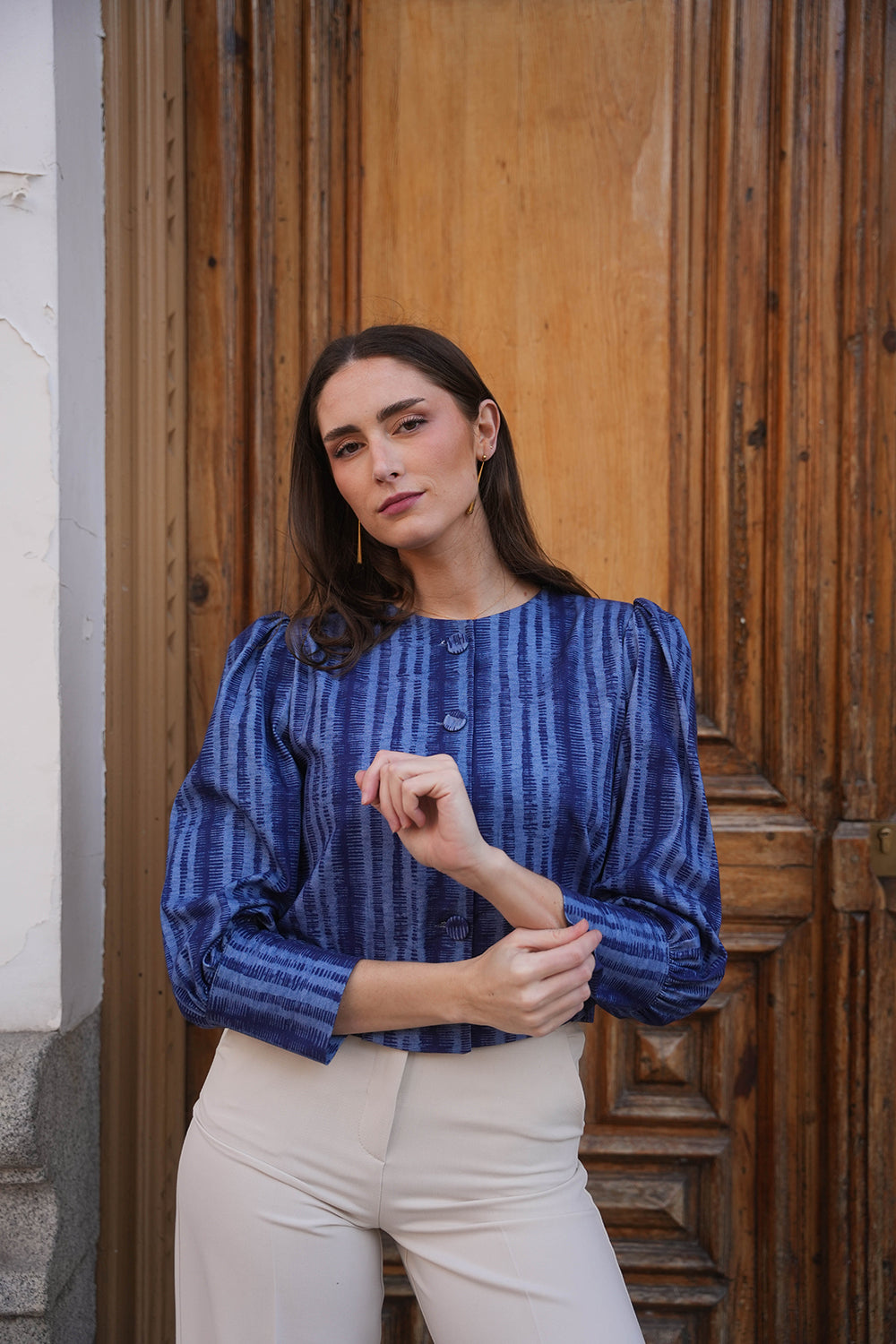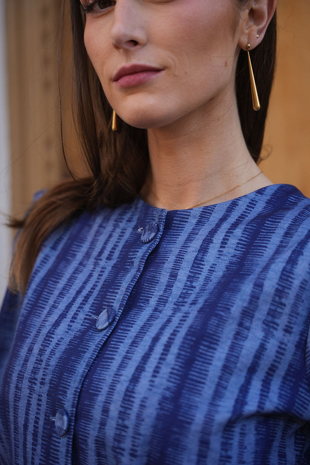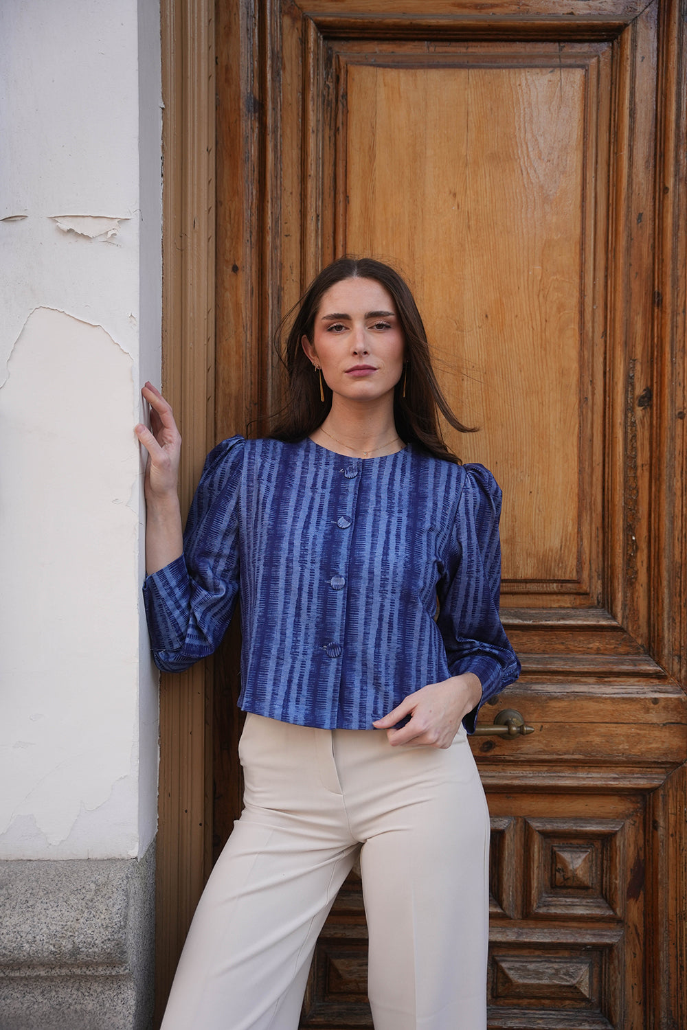 - Chaqueta de algodón de cuello redondo con botones forrados a tono.