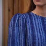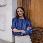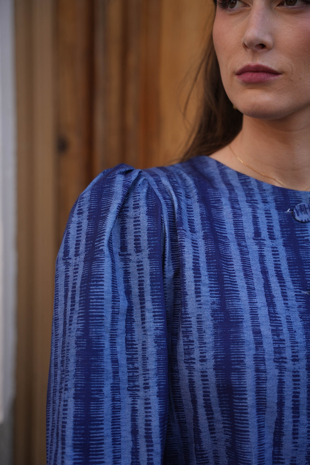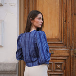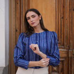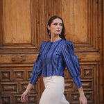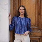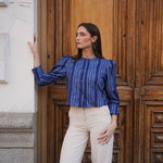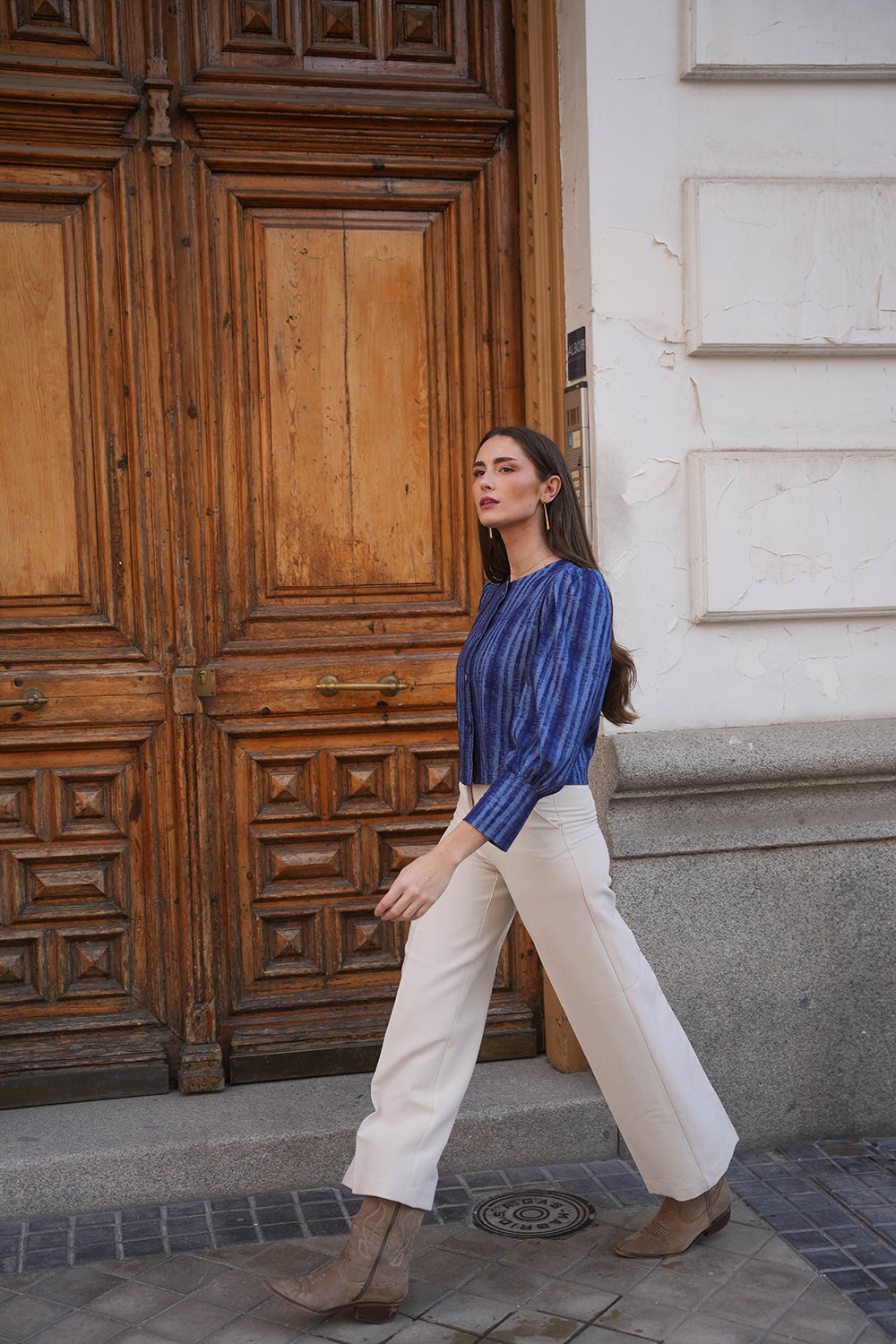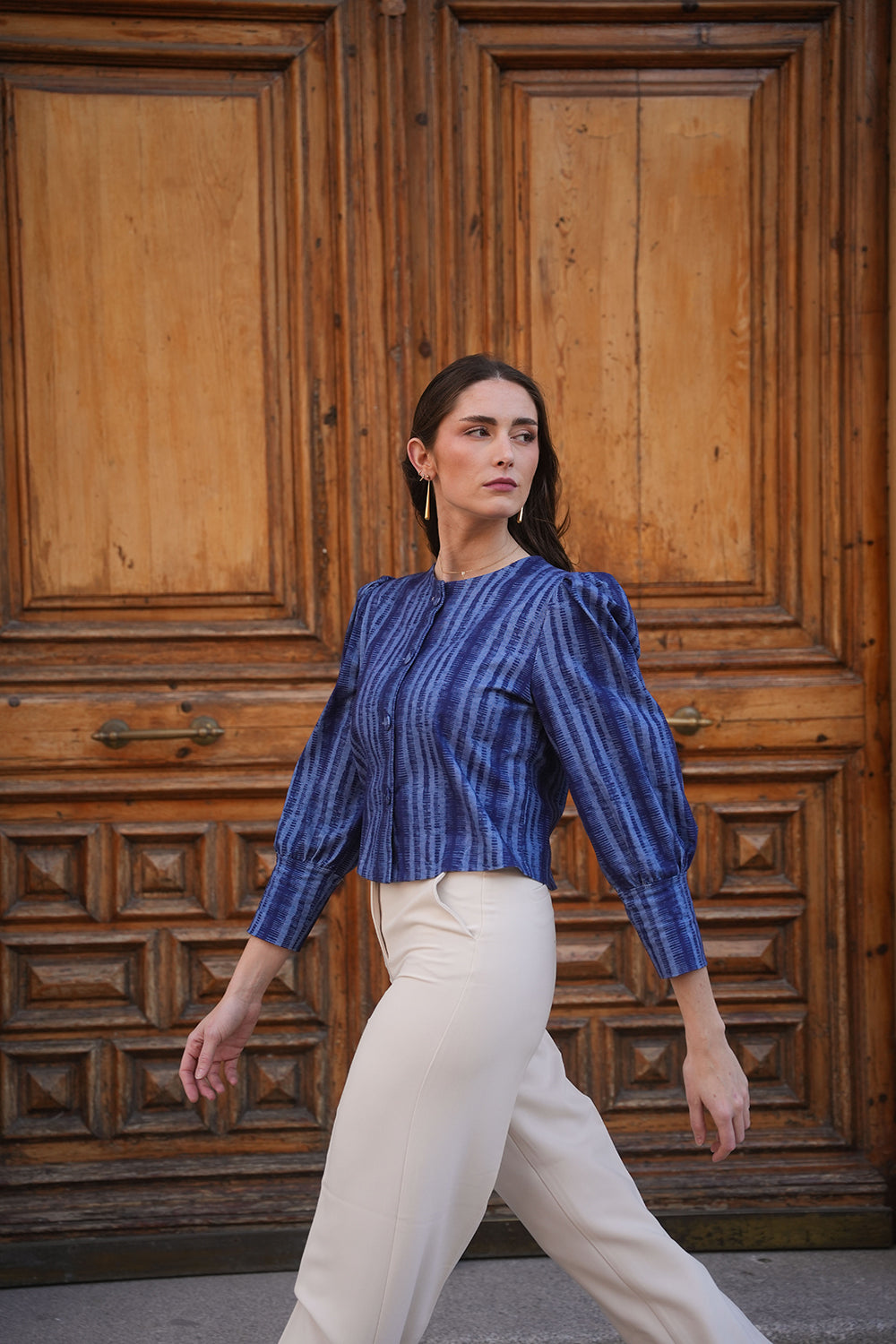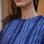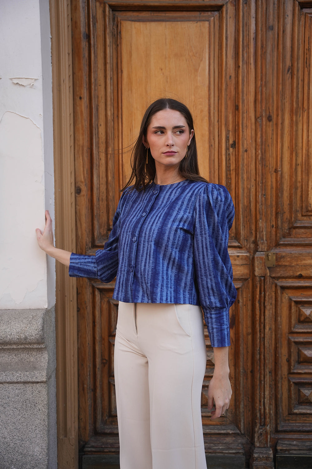 - Chaqueta de algodón de cuello redondo con botones forrados a tono.