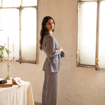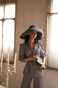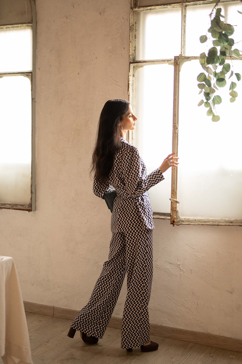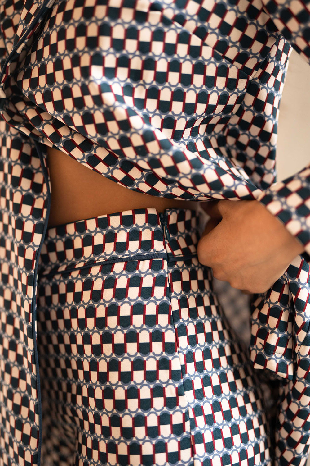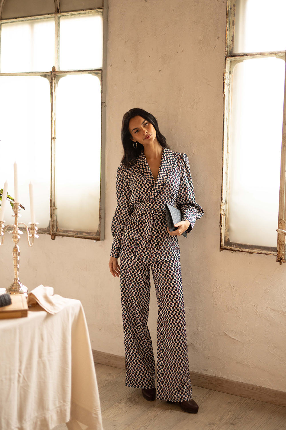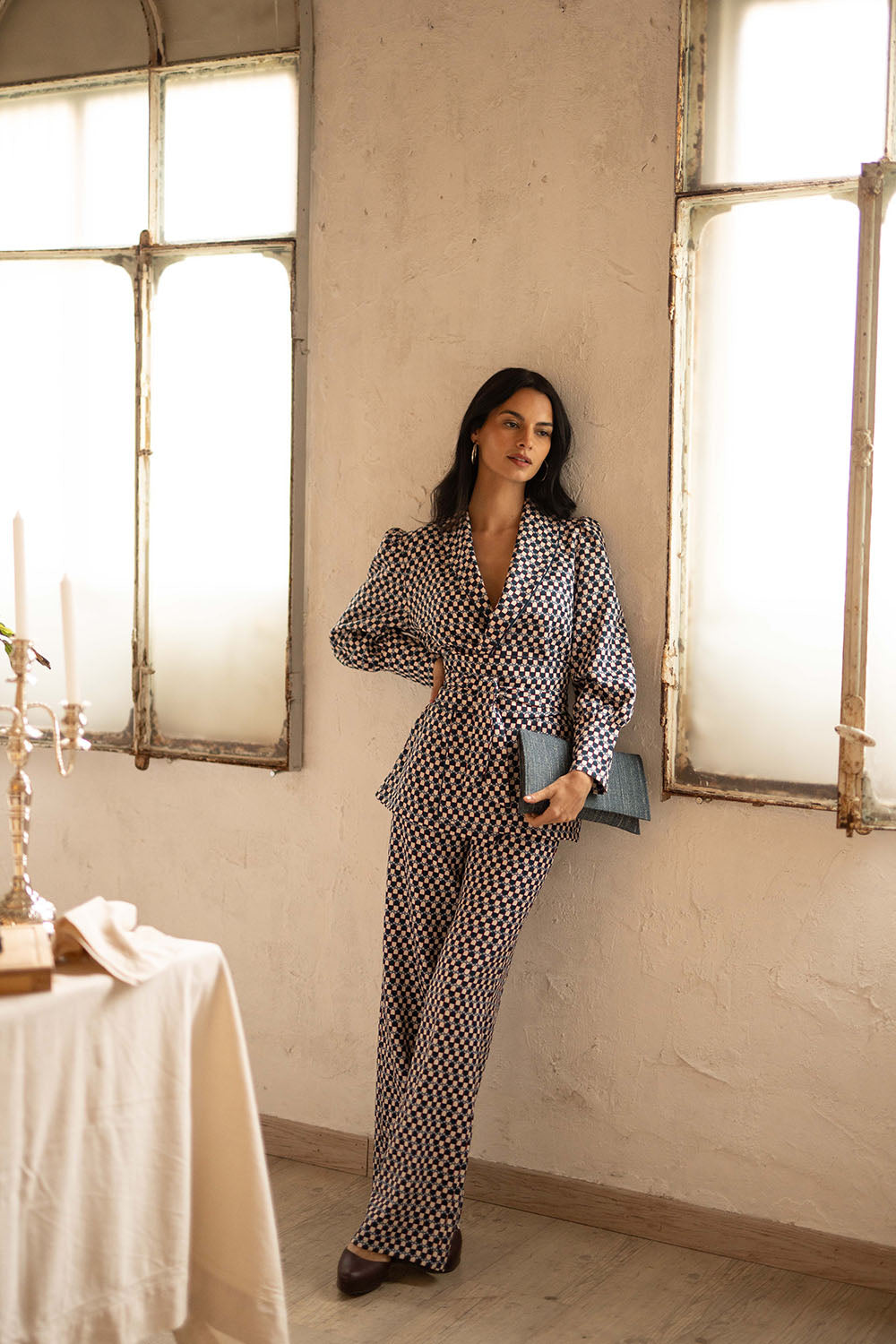 • Pantalón de traje de invitada con estampado geométrico en tonos azules