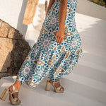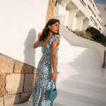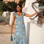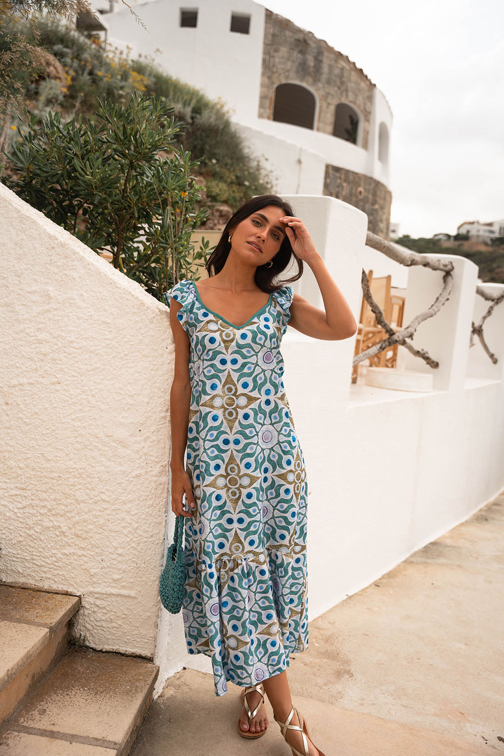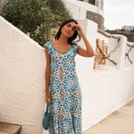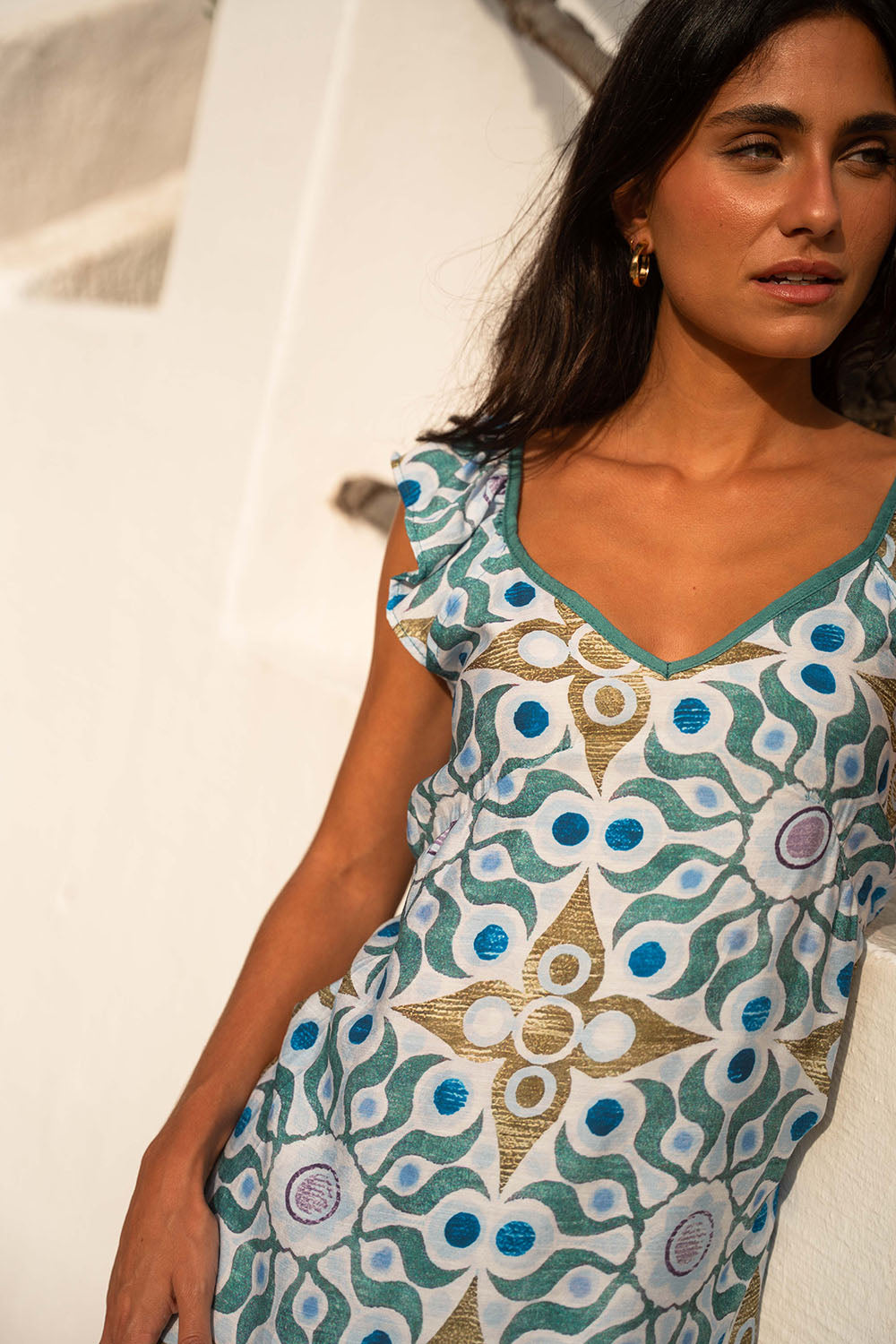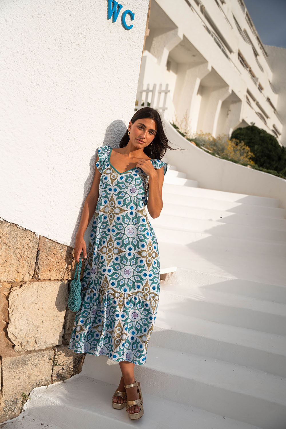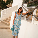 Vestido midi con escote en "uve" y detalle de ribete a tono. Con un volantito en la manga y un maxi volante en el bajo que le da movimiento y un toque romántico, su elástico en la espalda hace que se adapte súper bien. El estampado es grande y geométrico, con ese toque de mosaico que nos traslada a la arquitectura mediterránea.
