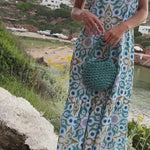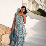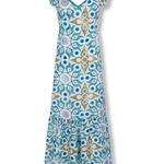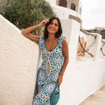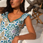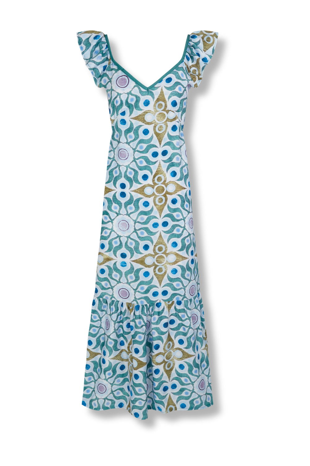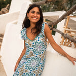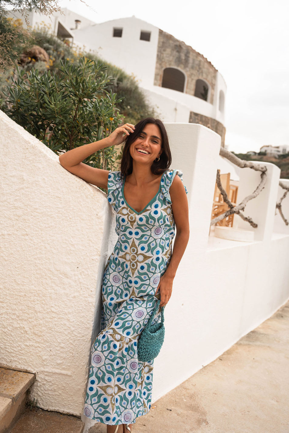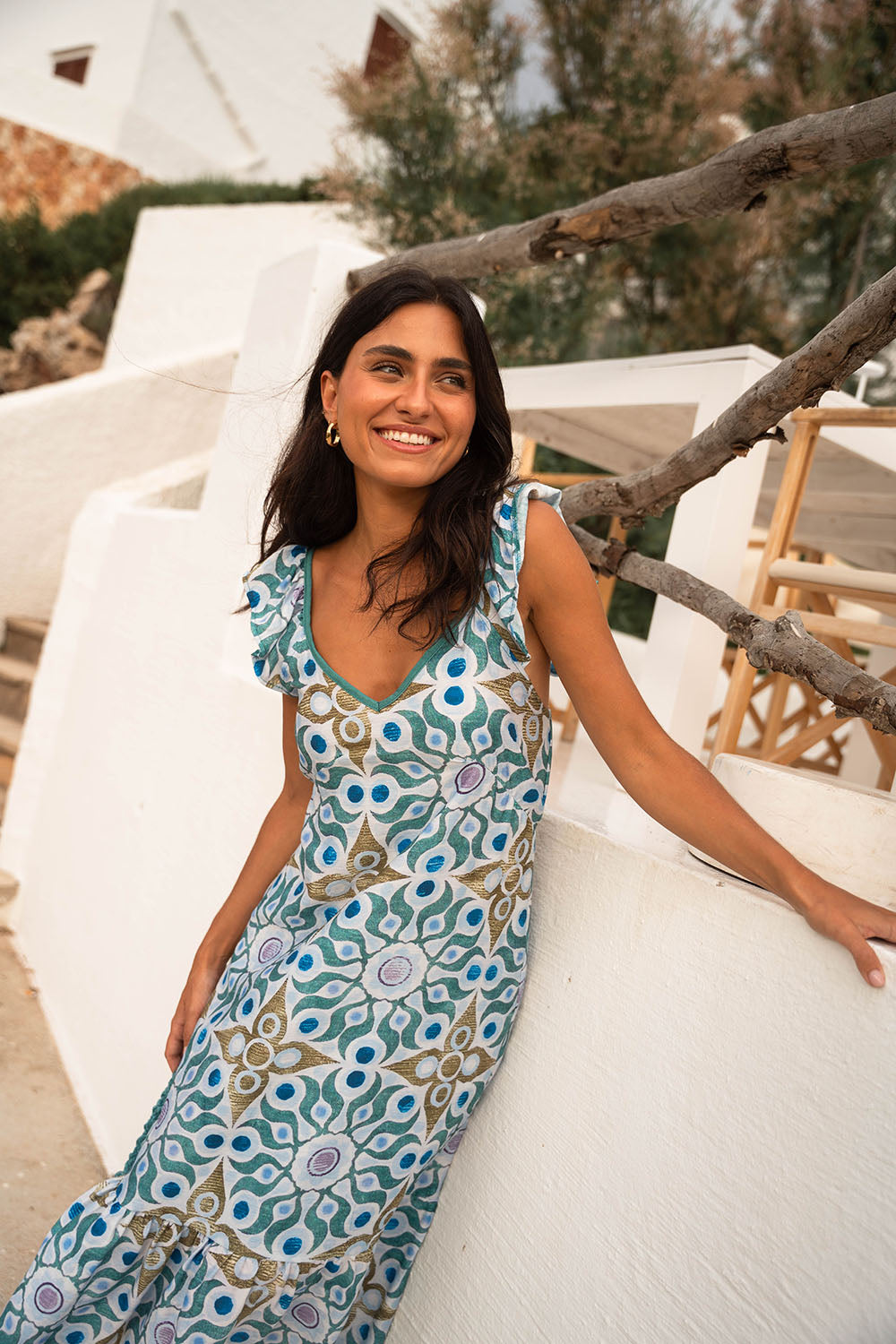 Vestido midi con escote en "uve" y detalle de ribete a tono. Con un volantito en la manga y un maxi volante en el bajo que le da movimiento y un toque romántico, su elástico en la espalda hace que se adapte súper bien. El estampado es grande y geométrico, con ese toque de mosaico que nos traslada a la arquitectura mediterránea.