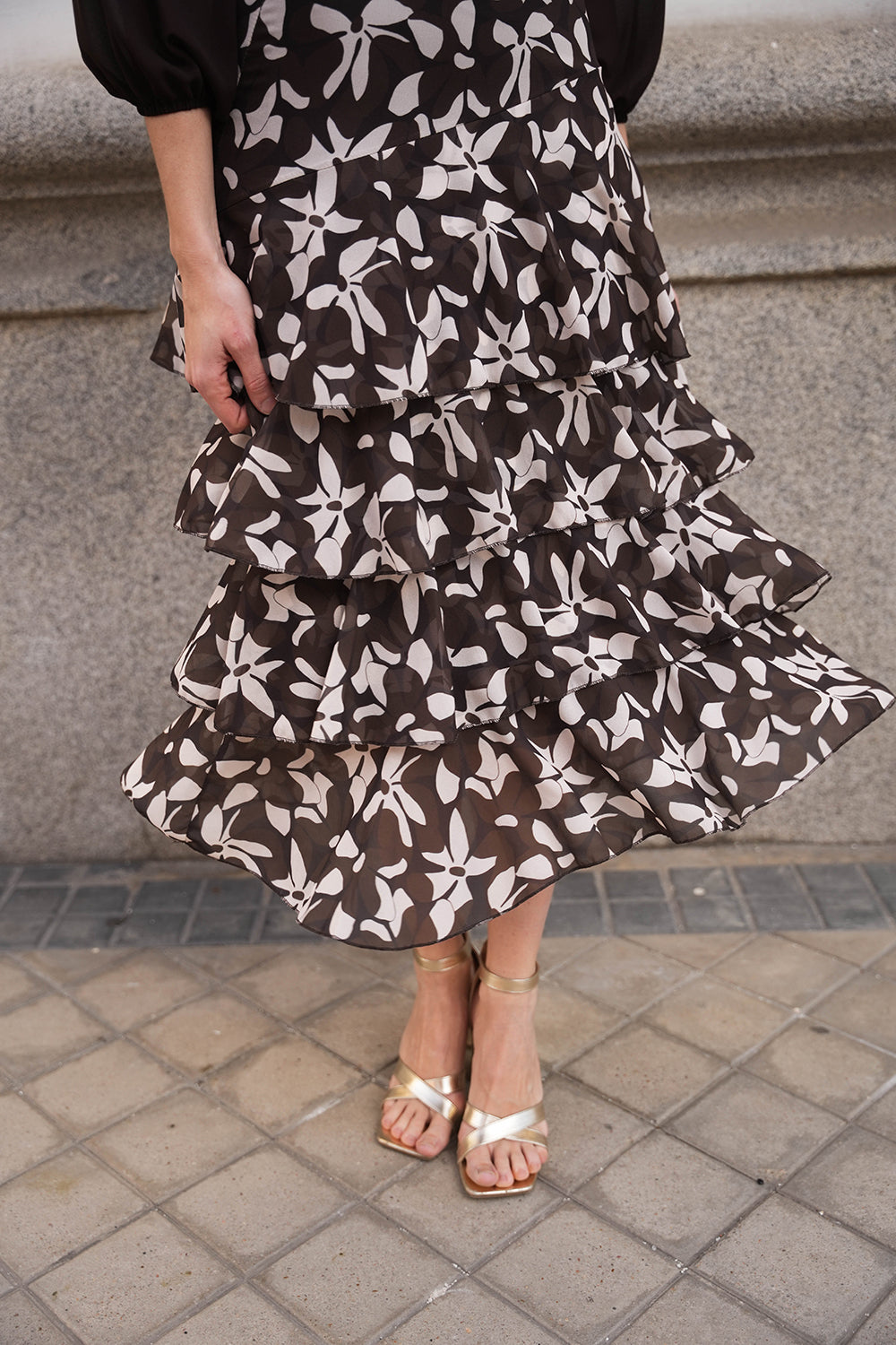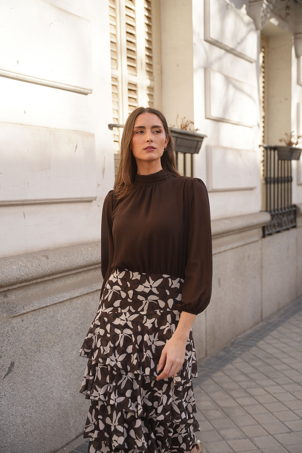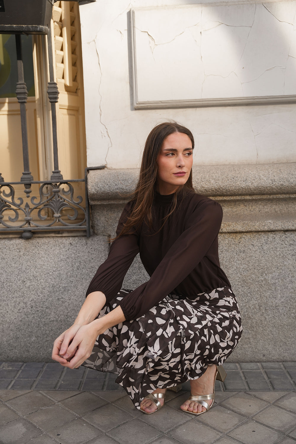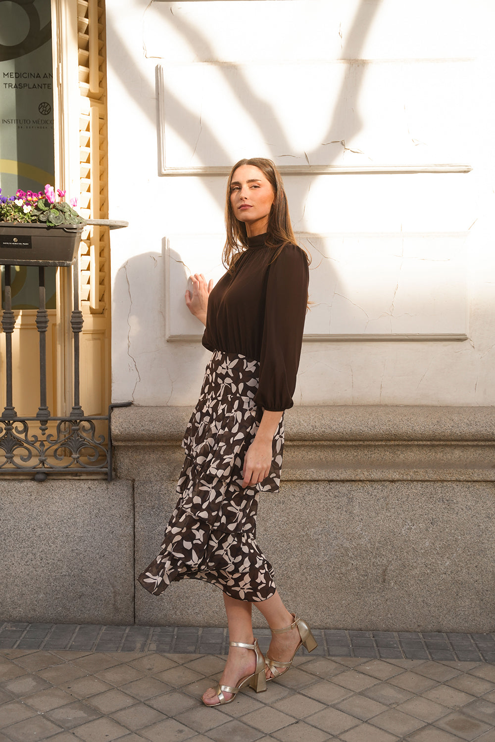 • Vestido de gasa largo con la zona del cuerpo en marrón y la falda con estampado floral a tono