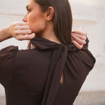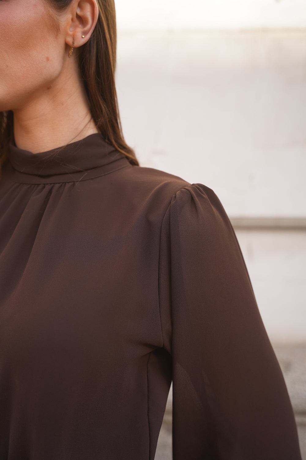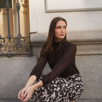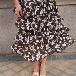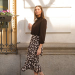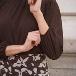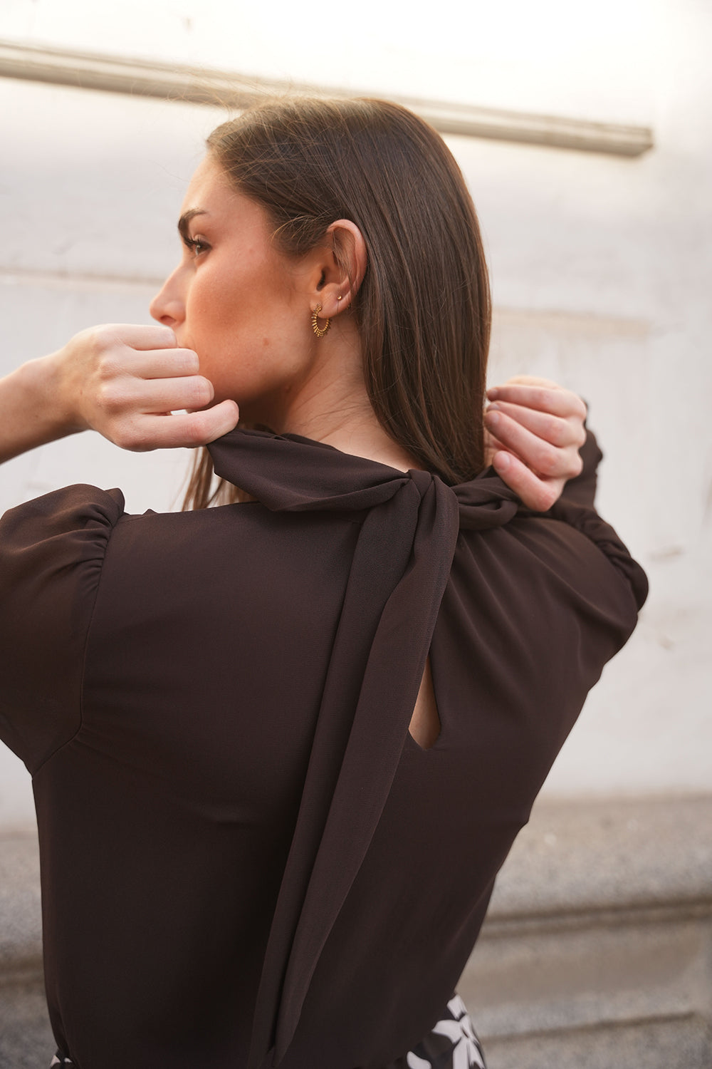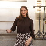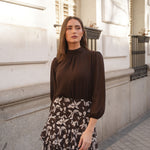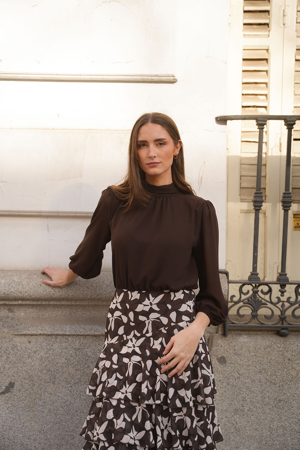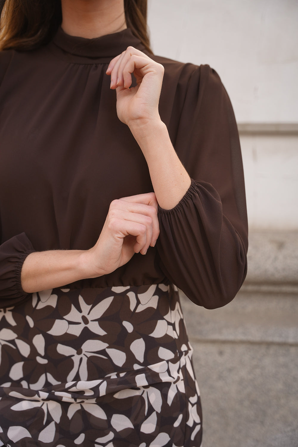 • Vestido de gasa largo con la zona del cuerpo en marrón y la falda con estampado floral a tono