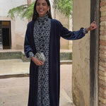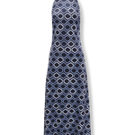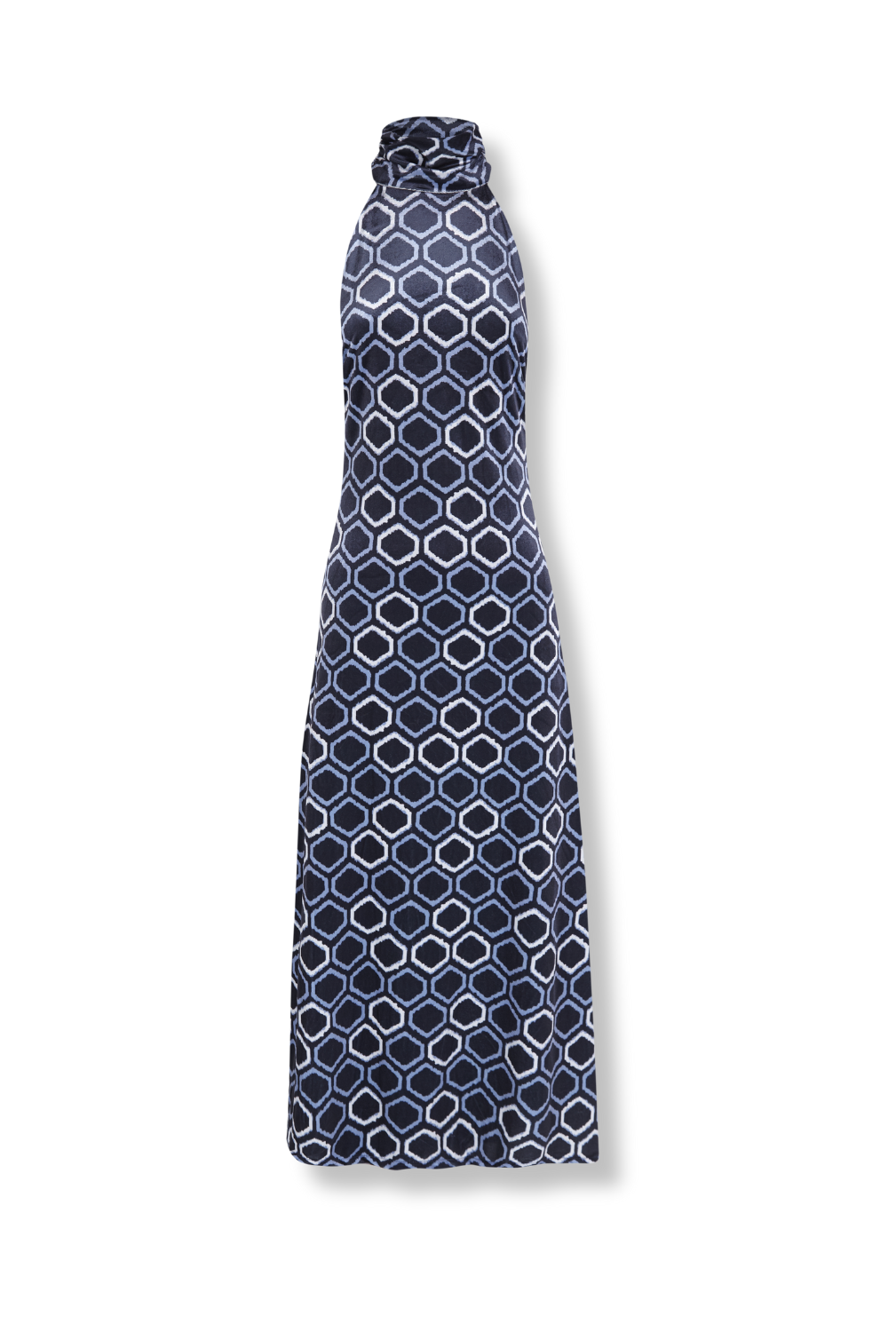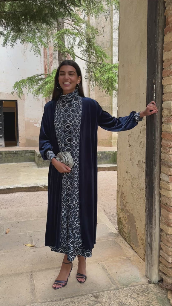 • Vestido de terciopelo con estampado geométrico en tonos azules forrado en gasa a tono.
