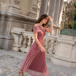 • Vestido largo ajustado de tul con escote bardot y corte en la cadera