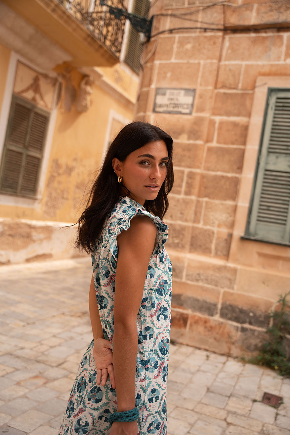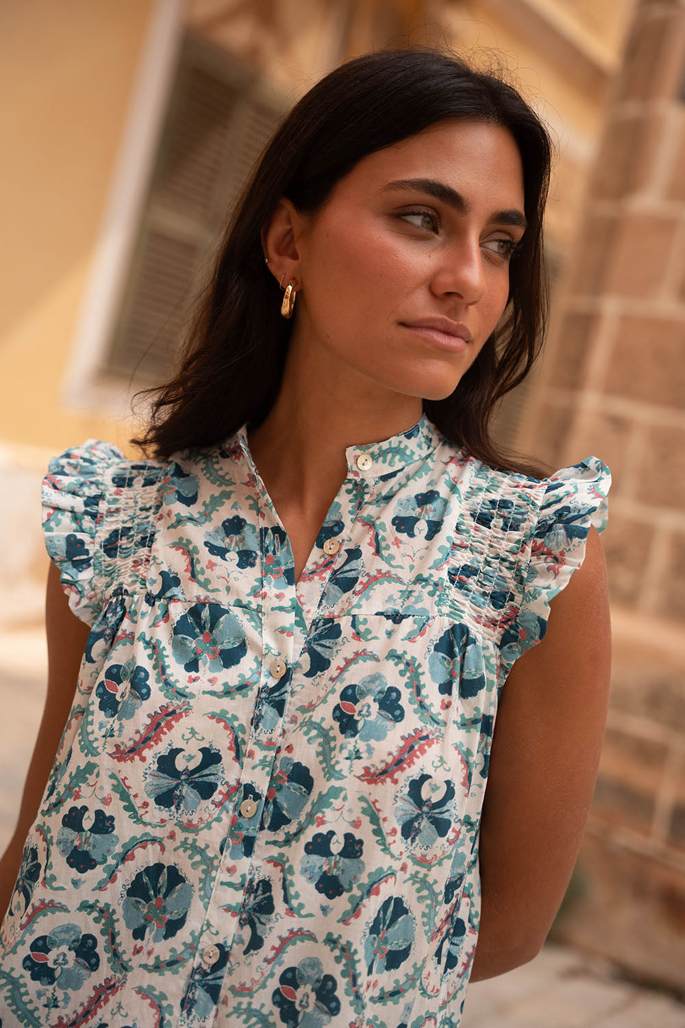 • Detalle de frunces en la zona del hombro y volante a modo manga